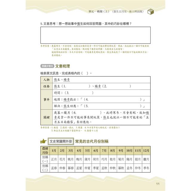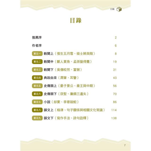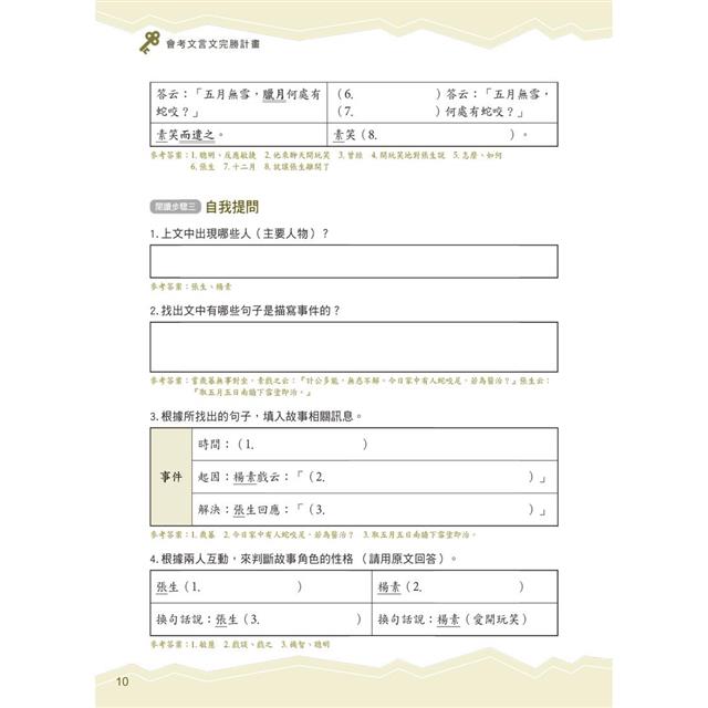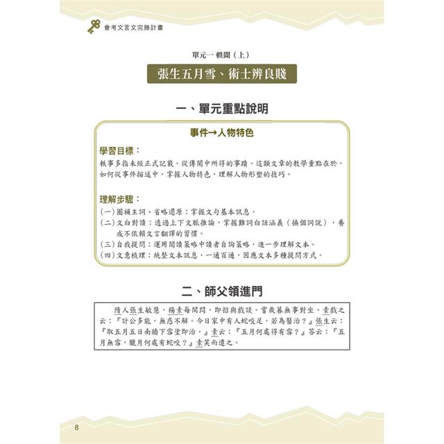 書中除了理解文意的訓練之外,還希望能帶領同學一步步學會由文章中摘重點、推論作者旨意並進一步學會表達自己的觀點;同時利用文史常識開外掛的小單元,讓同學對文言文的理解不但加深,還能加廣。