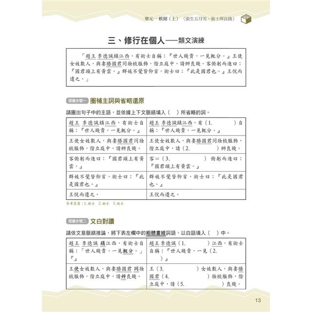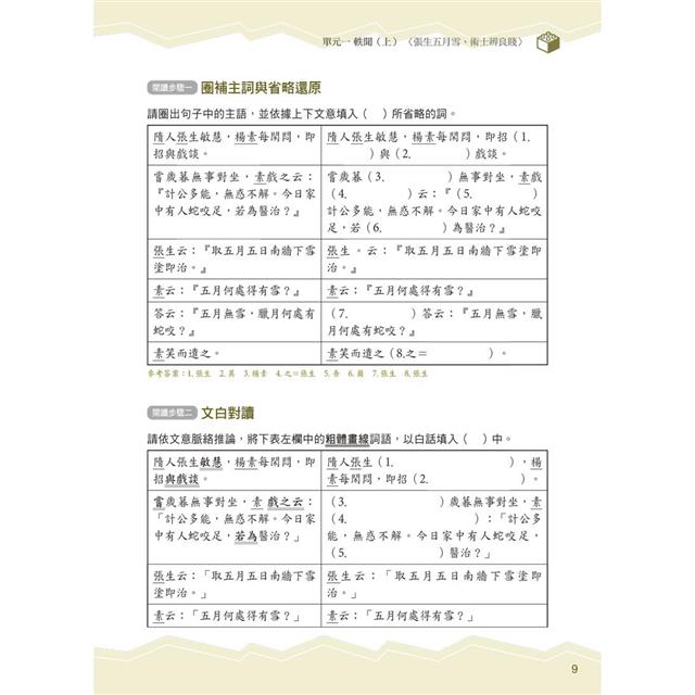 ● 解題策略 創新易懂:以填表方式,解構文章脈絡,圈補關鍵詞語,並以文白對讀方式,完全掌握全文意趣。