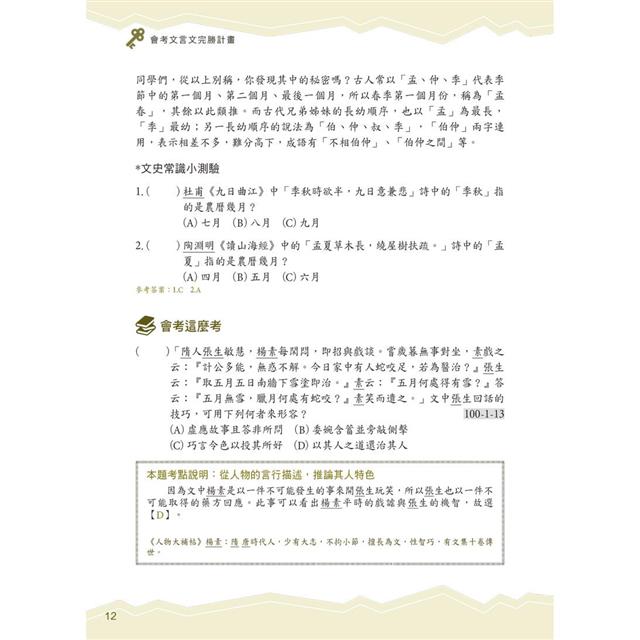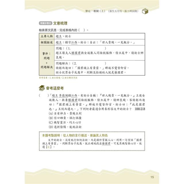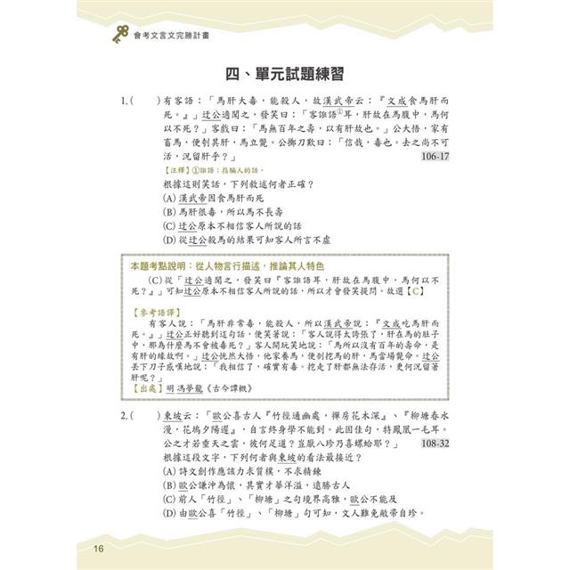 ● 類題演練 強化學習:根據會考考題趨勢,精選演練相關範文,拓展文言文素養,助益學生熟稔應試法門。