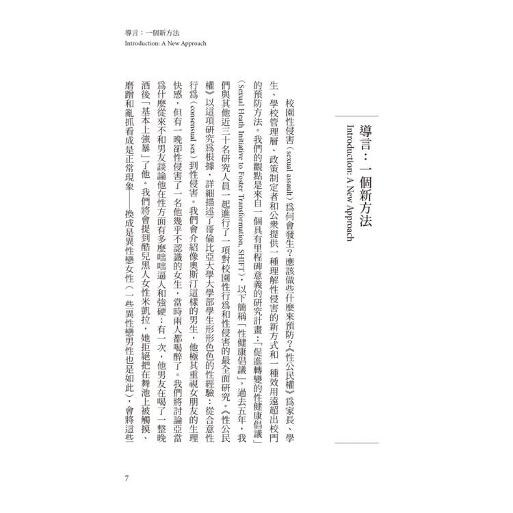 對校園性侵害的恐懼已成為大學經驗中不可分割的一部分。研究表明,到畢業時,多達三分之一的女性和近六分之一的男性遭遇過性侵害。但為什麼性侵害在大學生活中如此常見?可以採取什麼措施來預防?藉助迄今為止最全面的校園性侵害研究──在哥倫比亞大學進行的「促進轉變的性健康倡議」調查——珍妮佛.赫希和沙姆斯.康提出了一個全新的框架,強調性侵害的社會根源,跳出當前專注於同意、把校園視為「獵場」的掠食者,以及危險的勾搭文化等議題的辯論。