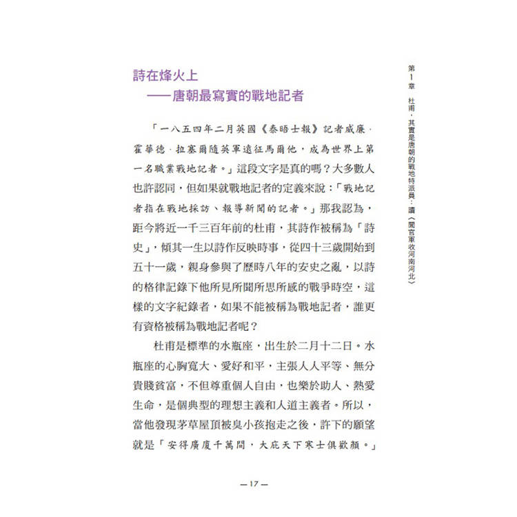 「一八五四年二月英國《泰晤士報》記者威廉‧霍華德‧拉塞爾隨英軍遠征馬爾他,成為世界上第一名職業戰地記者。」這段文字是真的嗎?大多數人也許認同,但如果就戰地記者的定義來說:「戰地記者指在戰地採訪、報導新聞的記者。」那我認為,距今將近一千三百年前的杜甫,其詩作被稱為「詩史」,傾其一生以詩作反映時事,從四十三歲開始到五十一歲,親身參與了歷時八年的安史之亂,以詩的格律記錄下他所見所聞所思所感的戰爭時空,這樣的文字紀錄者,如果不能被稱為戰地記者,誰更有資格被稱為戰地記者呢?