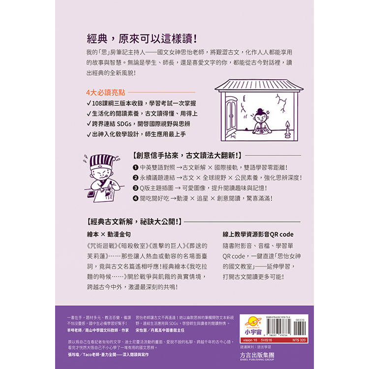 隨書附影音、音檔、學習單QR code,一鍵直達「思怡女神的國文敎室」 ──延伸學習,打開古文閱讀更多可能!
