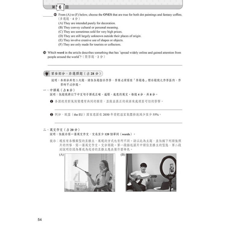 常春藤命題團隊透過對學測試題的通徹分析與嚴謹命題,百分百呈現學測英文的測驗重點:閱讀技巧、單字活用(日常高頻搭配語)、文章脈絡承接、資訊轉化(文字轉圖片或圖表資訊),讓你在學測前遇見各種可能出現的題目 / 題型,獲得充分的練習與準備!尤其在每年越來越無法預測的第一部份詞彙題,藉由題本,你能在練習時學到許多單字不同情境的高頻用法,而不僅是課本中你已熟悉的意思。閱讀測驗題目兼顧了主旨題、細節題、推論題之外,也很用心地安排許多文字轉圖片題、句子含意題(underlyingmeaning)、文章結構題、作者態度題,非常精準抓到學測走向,帶你有深度的閱讀體驗、熟悉閱讀重點及掌握推論方法。令人頭痛的混合題,也有多樣文本變化,可讓你在學測前熟悉多種文體、掌握先機!