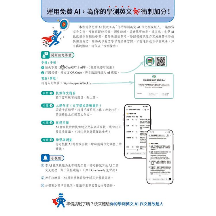 書內提供「你的學測英文AI作文批改超人」,此為免費AI作文批改模組,可為你的寫作提供立即可優化的修改建議,即時找出文法錯誤;更可搭配書內2篇範文學習高分寫法,提升作文實力。