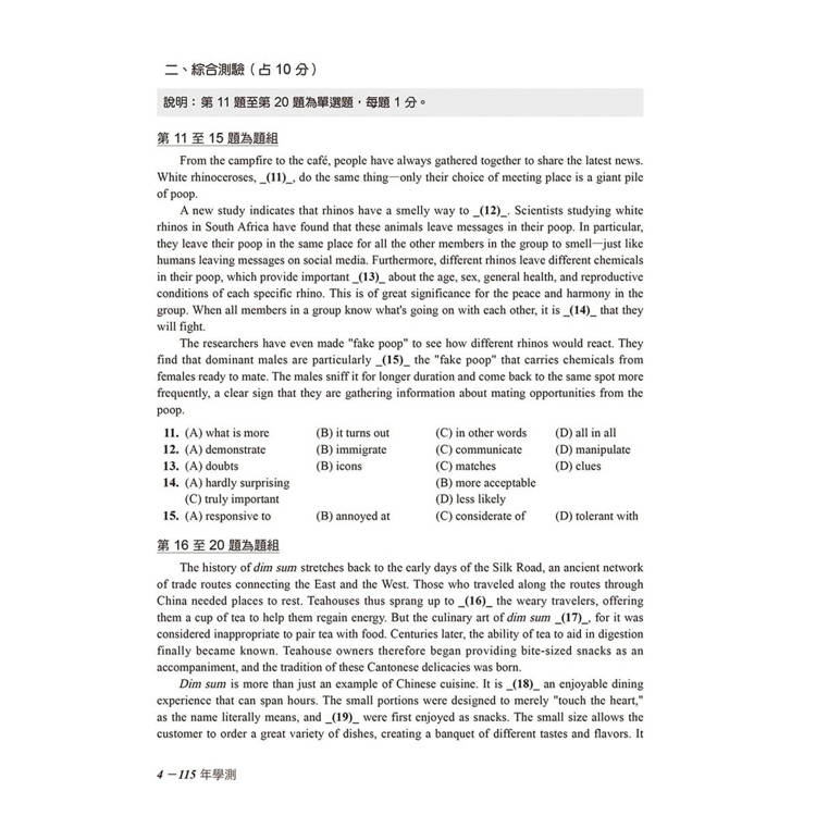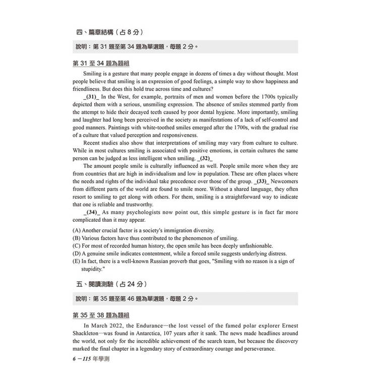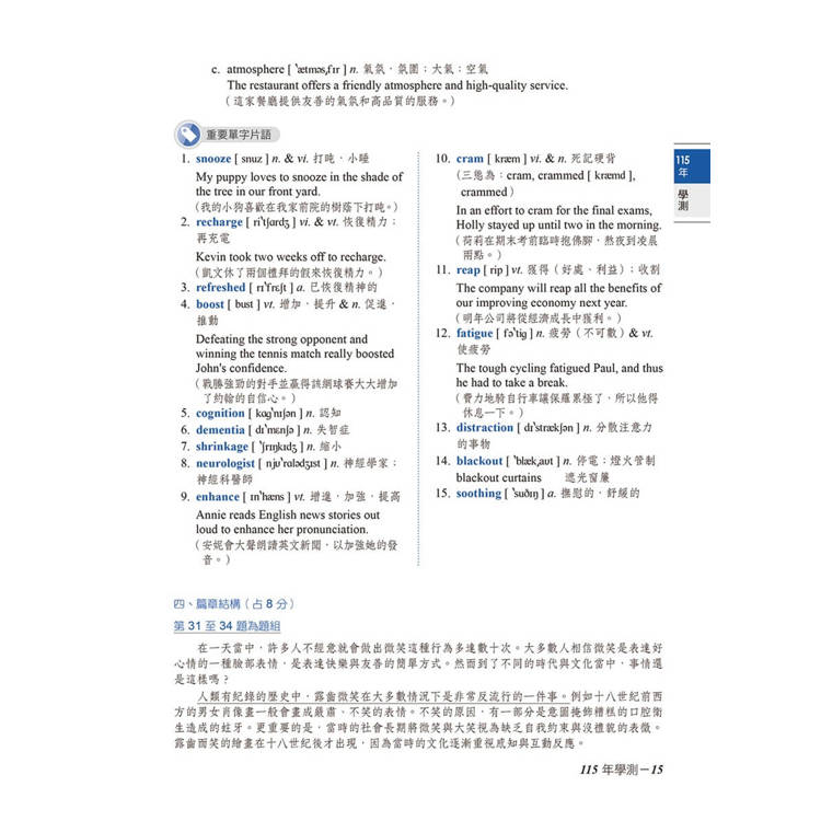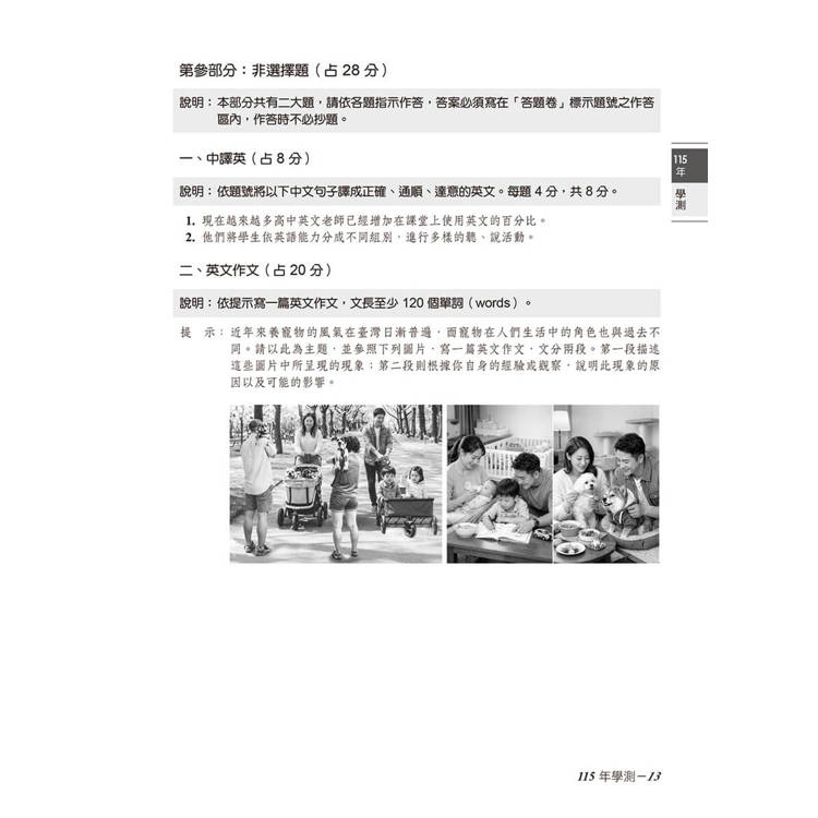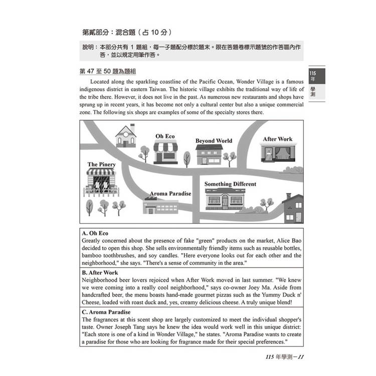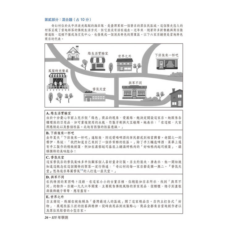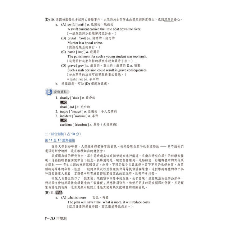新制學測英文考題融合歷屆學測、指考與108課綱核心素養的命題精神,與以往的學測最大不同點在於新增兩種題型:篇章結構與混合題。「篇章結構」雖是舊式學測未曾出現的題型,卻是指考必考題型,且從115學年度開始,本題型由原先的4個選項搭配4個答案,改為5個選項搭配4個答案;為兼顧考生需求,我們納入近五年指考試題與詳解,不但可以多練習篇章結構,更能挑戰難度較高的試題。「混合題」則為新制學測的另一特點:打破以往閱讀測驗選擇題的出題方式,以核心素養為主軸,考生需將文章內容融會貫通之後,再以選擇、勾選或是手寫方式回答問題,題目可能是擷取文章訊息,也可能是找出段落主題句……等。以115年的題目為例,考生需閱讀一篇關於臺灣東部原住民商業區的介紹文,了解各商店的特色,而後依照題目要求,從中找出2個單詞,並依句型結構適度變化後填入作答;另一題為多選題,考生需依題目內容挑選正確的商店填入代號;最後則為簡答題,依題目內容從文章中挑選單詞做答。