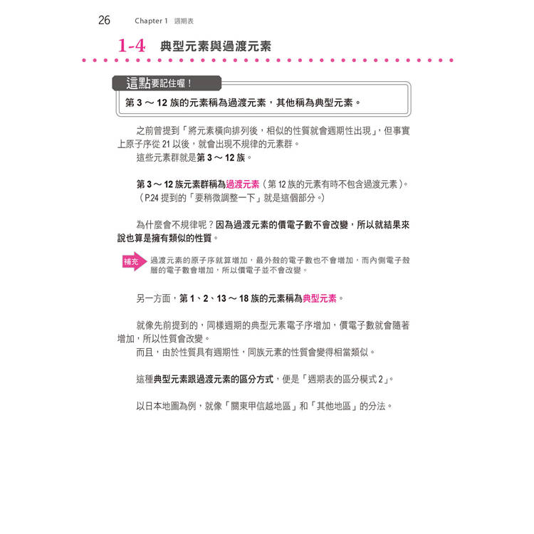 第3∼12族元素群稱為過渡元素(第12族的元素有時不包含過渡元素)。 (P.24 提到的「要稍微調整一下」就是這個部分。)