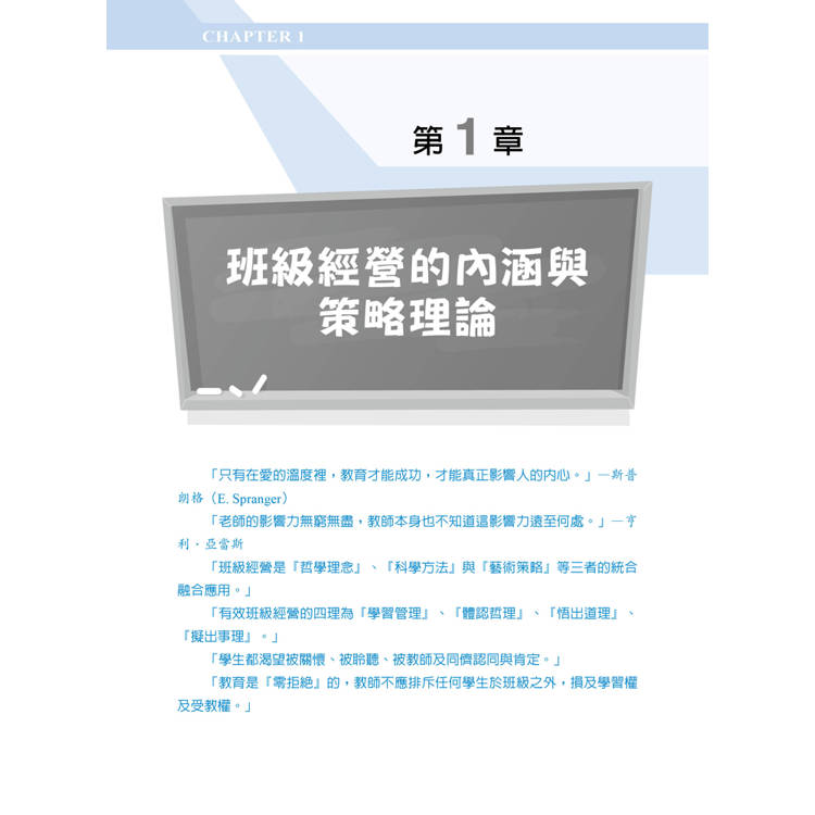 《班級經營理論與實務精要》為《班級經營:理論與實務》(四版)一書的內容重點與濃縮版,全書簡化為十三章,各章都是「班級經營」學科精髓與考試重要取向內容,各章獨立完整,全書精簡統整又有系統性,適合作為教師資格考試與縣市教甄的考試用書,也適合作為修讀教育學程的課堂用書。