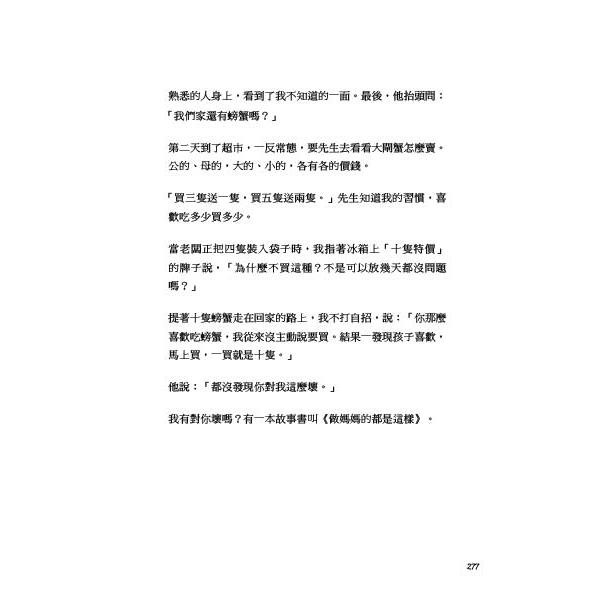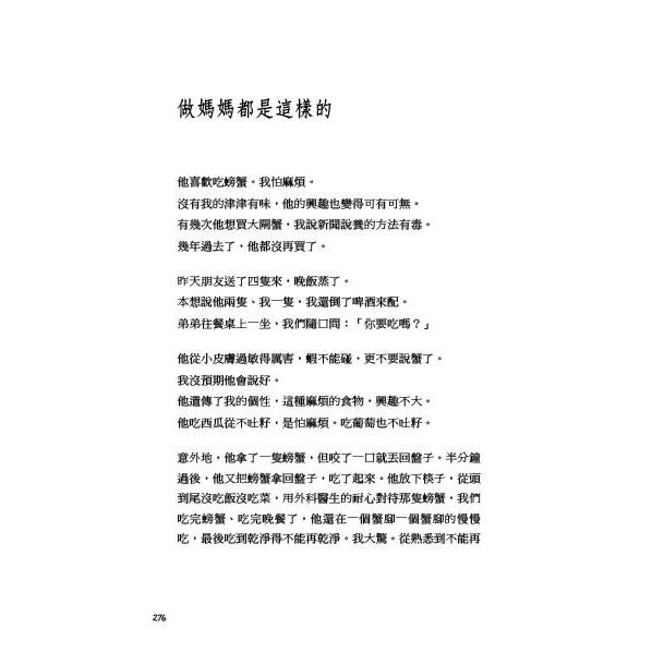 意外地,他拿了一隻螃蟹,但咬了一口就丟回盤子。半分鐘過後,他又把螃蟹拿回盤子,吃了起來。他放下筷子,從頭到尾沒吃飯沒吃菜,用外科醫生的耐心對待那隻螃蟹,我們吃完螃蟹、吃完晚餐了,他還在一個蟹腳一個蟹腳的慢慢吃,最後吃到乾淨得不能再乾淨。我大驚。從熟悉到不能再熟悉的人身上,看到了我不知道的一面。最後,他抬頭問:「我們家還有螃蟹嗎?」