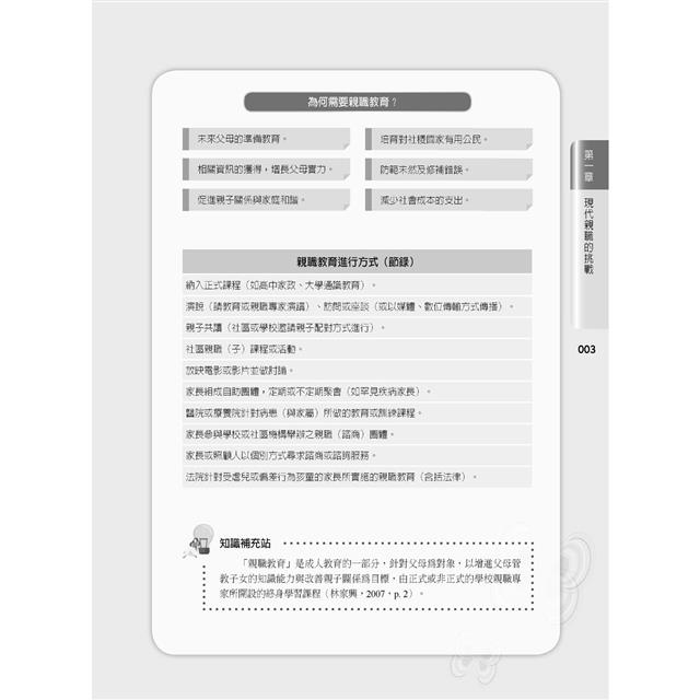 這本親職圖文書是以作者多年前所撰寫的「親職教育」為基礎,加上霸凌、家庭溝通,以及數位科技與親職,以一頁文一頁圖表方式呈現,希望以這樣簡單易讀的方式,將親職教育的基本理念與實務介紹給讀者。