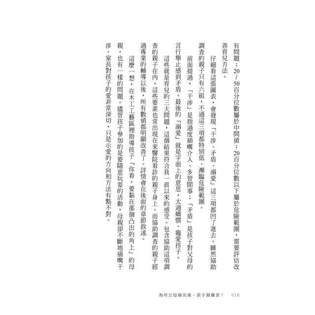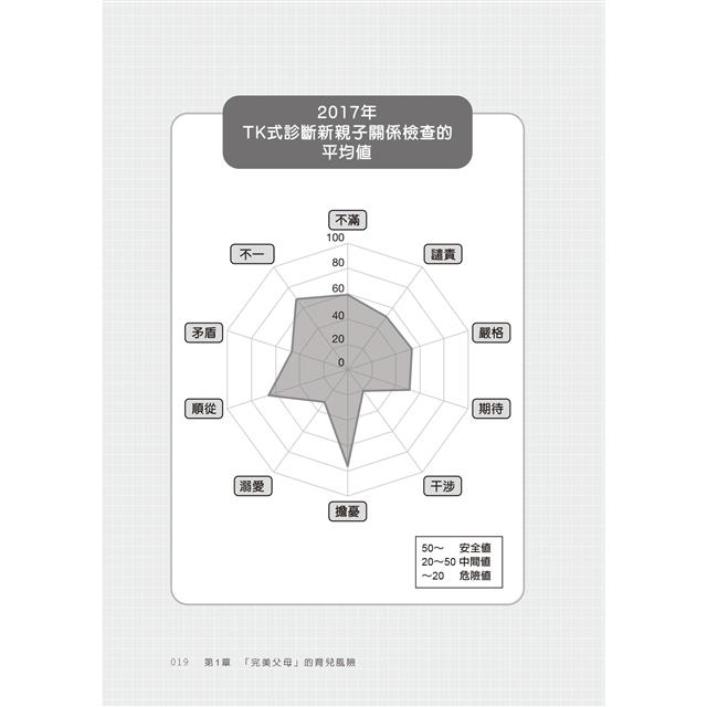 檢查的平均值如19頁的十角形圖表所示,數字越低,代表育兒方式的問題越大。在50百分位數(統計學的代表數值)以上屬於安全範圍,代表這種育兒方法沒有問題;20~50百分位數屬於中間值;20百分位數以下屬於危險範圍,需要評估改善育兒方法。