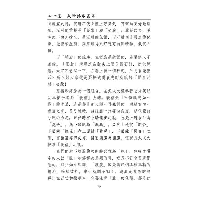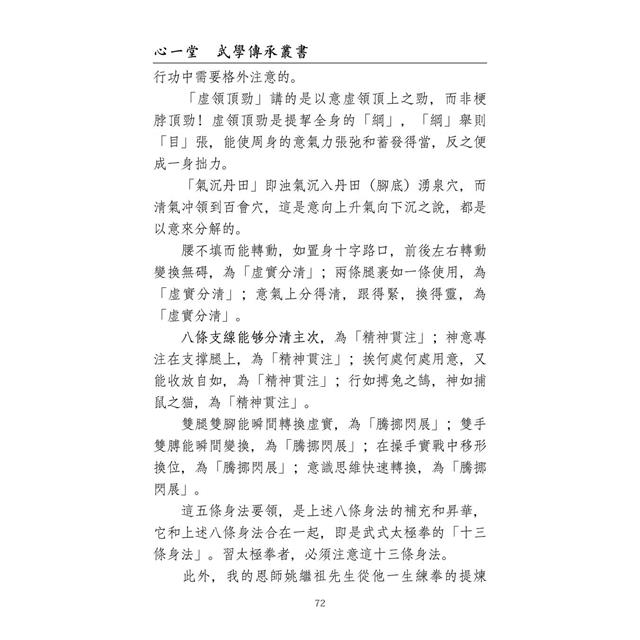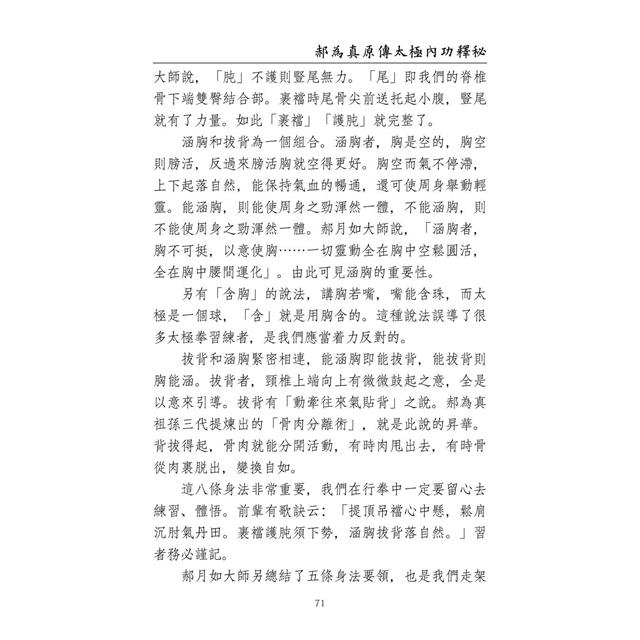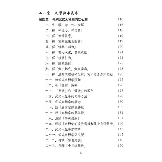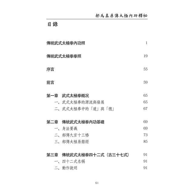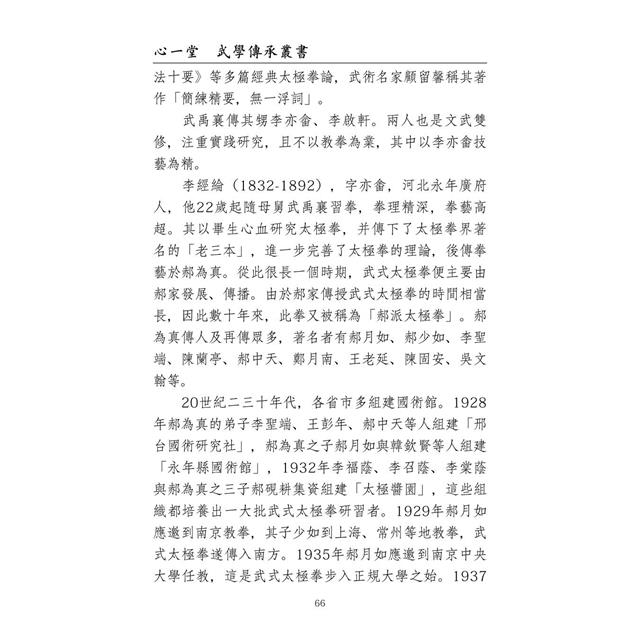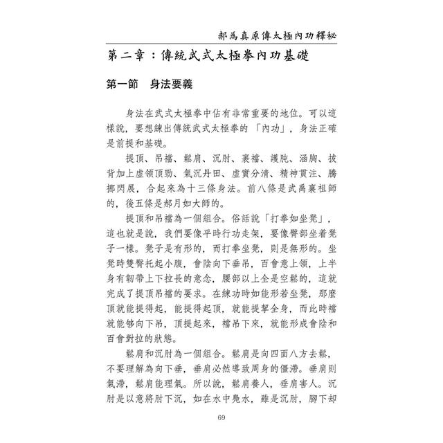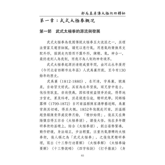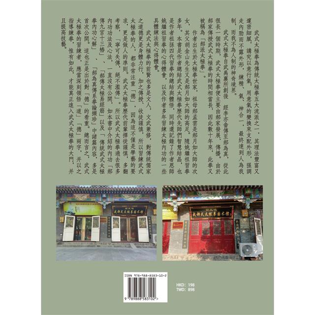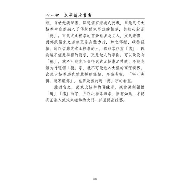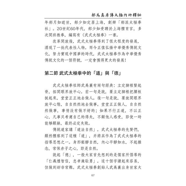 武式太極拳的前賢也多是文人,文武兼修,對傳統儒家之道德更是身體力行,加之傳授、收徒謹慎,所以習練武式太極拳的人,都非常注重「德」,因為這不僅是學藝的要求,更是做人的準則。武式太極拳歷代前輩擇徒謹慎,多番考察,「寧可失傳,絕不濫傳」。所以武式太極拳過去很多內功功法及心法,一直沒有公開,如本書中介紹的內功「郝傳九宫十三樁」 、「郝傳太極易經筋」以及「傳統武式太極拳內功心解」 、「郝為真傳系拳論擷珍」中諸篇内容,多是首次公開。這也正是出於對「德」的看重。總而言之,武式太極拳的習練者,應當深刻領悟「道」「德」兩字,并以之指導練拳,惟有如此,才能真正進入武式太極拳的大門,并且提高技藝。