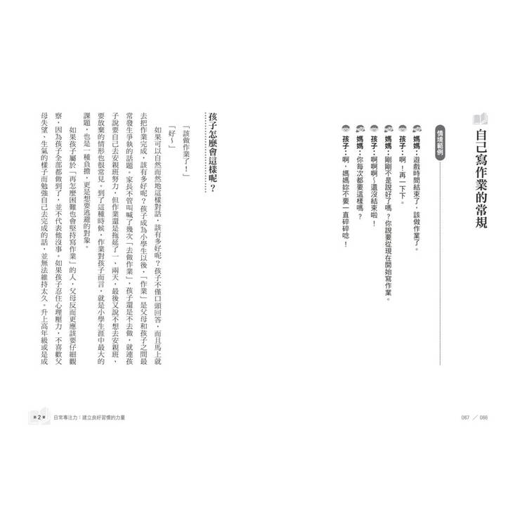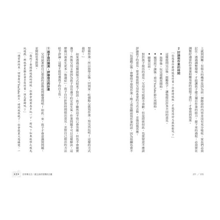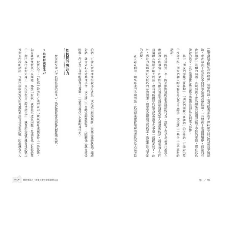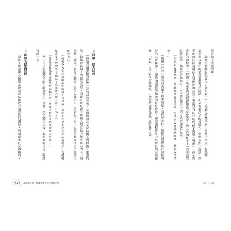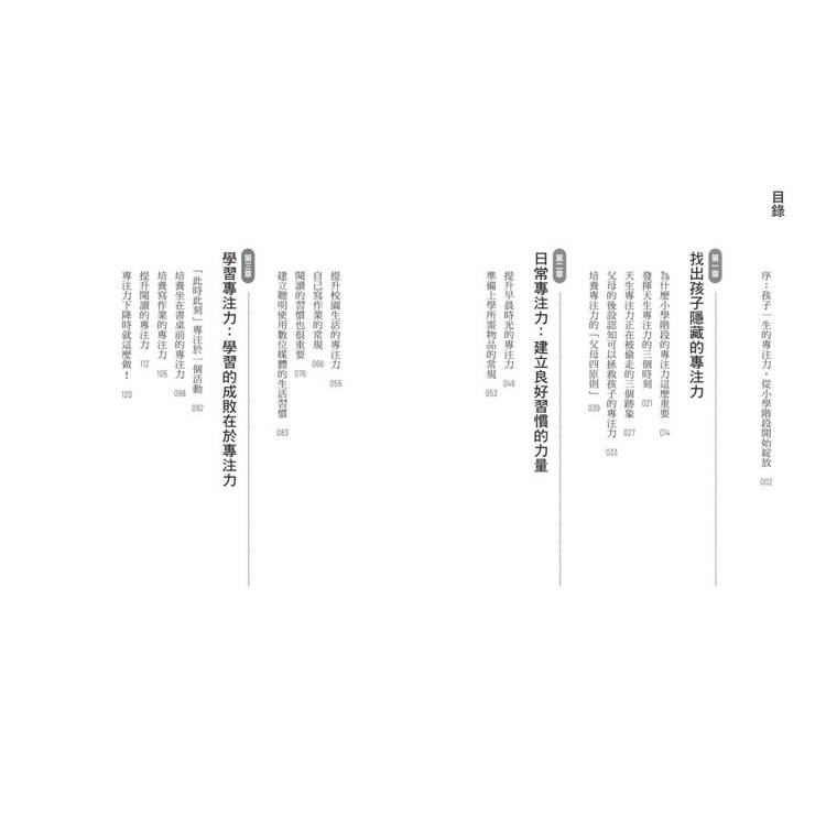 作者提出 35 個具體方案,幫助家長在日常生活裡重建孩子的專注力,包括規劃作息、調整環境、培養閱讀與遊戲習慣、合理管理媒體使用等。作者強調,父母不必一再催促「專心」,而是要透過正確的引導,讓孩子自然進入專注狀態。
