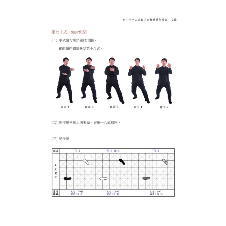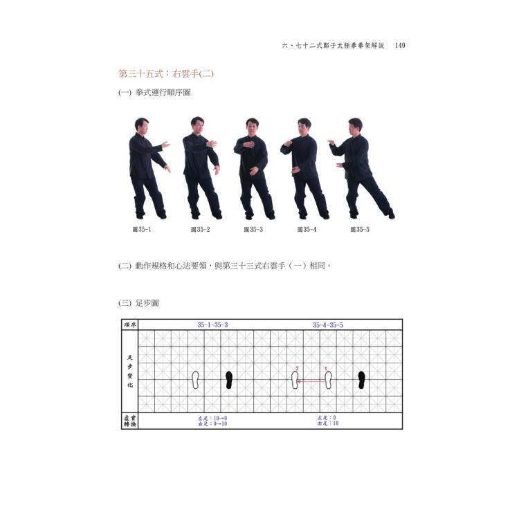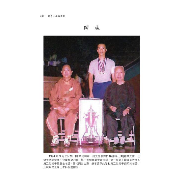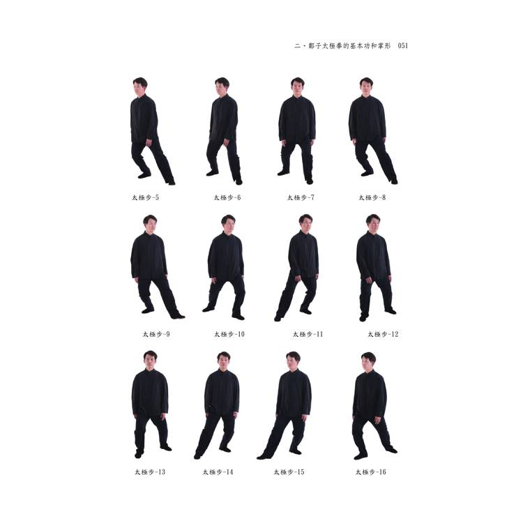 今在其工作事業繁忙之餘,為推廣鄭子太極拳,更要出專書,將多年所學、所得,不藏私的貢獻出來,精神著實令人佩服。書中包含了:基本功的站樁與步法、鄭子37式太極拳、及鄭子54式太極劍等的規格認知、練法、及心法要領,有許多其獨到的見解,並附上大量的照片及足步圖,詳細的解說分明,欲令讀者能更加瞭解,其立意用心,躍然紙上。