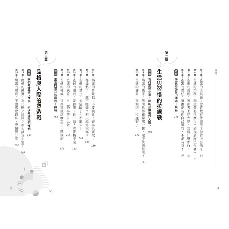 全書涵蓋「學習與成長」、「生活與習慣」、「品格與人際」、「溝通與情緒」四大篇,