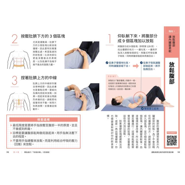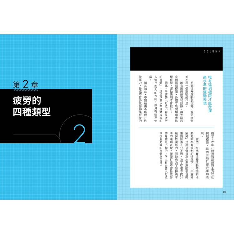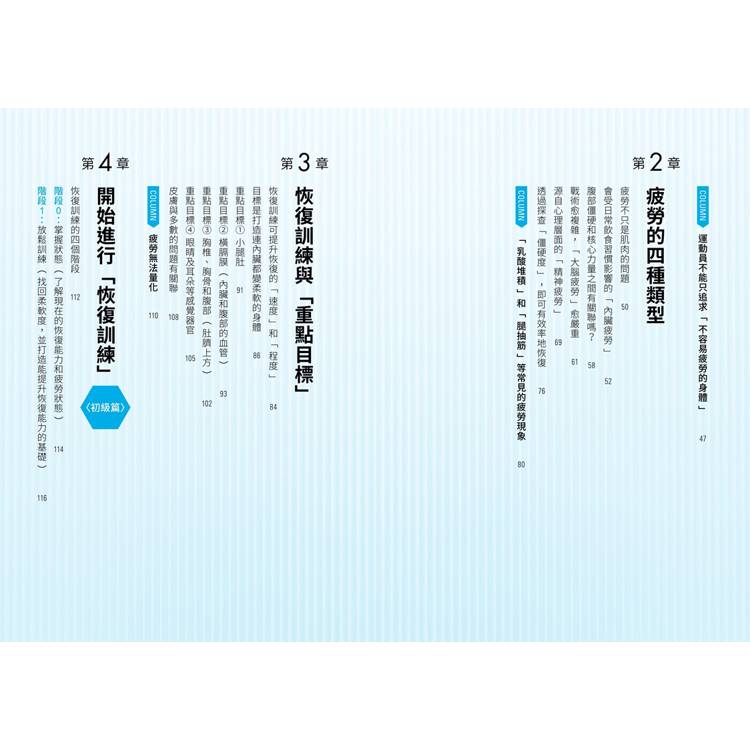 先檢視自己的疲勞狀態、確認僵硬部位,再透過呼吸和動作調整,一步步建立個人的疲勞恢復系統。不但有具體方法,還有練習的心法,強化實踐效果。這套訓練系統不僅幫助一般人解除疲勞,更提升了許多職業運動員的運動表現!