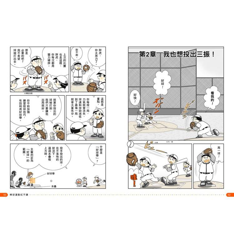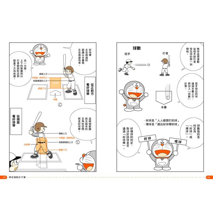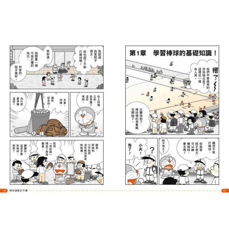 從場地規則開始到投球、揮擊及各種守備移動,幾乎包含所有棒球知識。但它又不是硬梆梆的教科書內容,因為本書有哆啦A夢,還有大雄、靜香、胖虎等化身為棒球選手的角色,用漫畫教棒球實在是太棒的點子,大家快來學棒球!