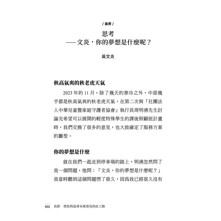 這種陪伴不僅是教育上的指導,更是一種生命上的同行。文炎讓我們看到,真正的社會工作與教育並不僅僅是傳遞知識,而是透過理解與尊重,讓每一個孩子都能找到自己的價值與希望。閱讀《負影》,我們不僅僅是在閱讀一個社會工作者的故事,而是走進了無數個特殊需求孩子的世界。這本書不僅是文炎這幾年服務經驗的結晶,更是一面鏡子,讓我們反思社會對於這些特殊需求孩子的態度,讓我們重新思考什麼是真正的教育與關懷。我誠摯地邀請每一位讀者細細品味這本書。它讓我們明白,傾聽無聲的呼喚,守護每一個被忽視的心靈,是多麼重要的一件事。