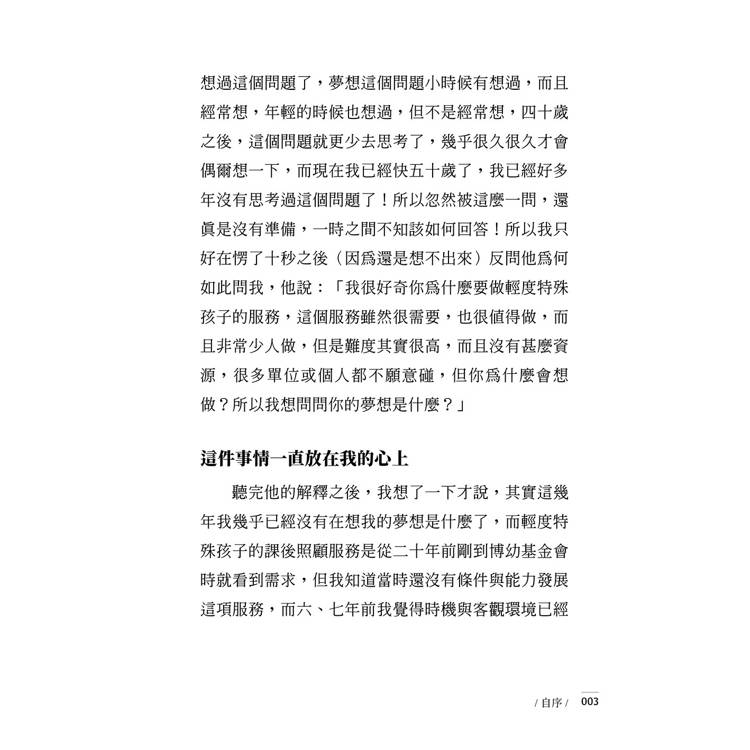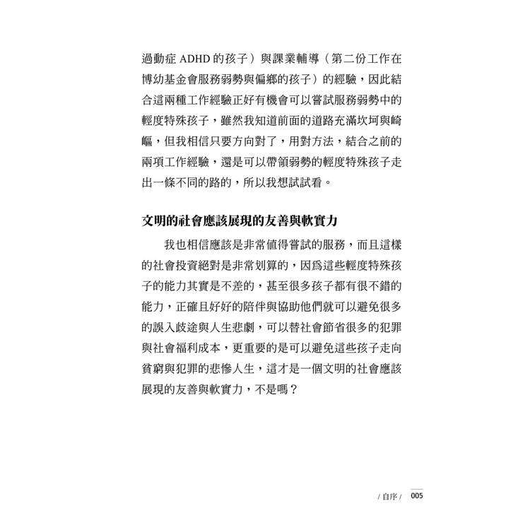 吳老師說,他原本只是想做一件「一直放在心上卻始終無法落實的事」—也就是為這些在主流社福與教育系統中「被夾縫遺忘」的孩子,提供一套完整的、貼近生活的課後照顧與成長支持。因為這些孩子,障礙不明顯到不被重視,又真實存在到影響他們的每一段人生。他們可能在學校被認為是「懶惰」、「不用心」,出了社會後卻又因為連簡單的收銀、加減法都做不好而一次次失業,最後走進貧窮、社會邊緣,甚至犯罪。透過一篇篇故事,我們看見學習障礙的女孩小薇,因為不會加減法而被加油站開除三次;我們看見有記憶力卻沒有理解力的小妤,口語表達出色卻總是答錯問題;我們看見患有妥瑞氏症的小后,在充滿接納的環境中症狀顯著減少;我們更看見了那些曾被誤會、標籤、壓抑情緒的ADHD 孩子,如何在支持下慢慢學會調節自己,並勇敢說出「我想再試一次」。這些故事告訴我們:孩子不是不能,而是沒有人願意好好理解他的「不能」。從專業角度來看,這本書實際點出了現行特殊教育、社會福利制度與實務現場之間的重大落差。例如:學習障礙在教育系統內能夠獲得資源,但一旦離開學校,就在《身心障礙者權益保障法》中被排除在外。也因此,這群成年後仍需要長期追蹤或就業支持的孩子卻硬生生地在制度下掉落,落入服務真空,錯失重要轉銜期的協助。更嚴重的是,連許多一線的教育或社福工作者,對「輕度障礙」的認識也仍有極大落差。他們不是「看起來很正常」嗎?不是「很會講話」、「很愛幫忙」嗎?但那些語言、記憶、行為的表現,不過是一層看起來健康的外衣,真正的困難—在閱讀理解、數學邏輯、社交判斷、情緒調控等面向—才是拖住他們一生發展的重擔。這些孩子不是走不動,是走得太累、太孤單,沒有人願意陪他們走長一點。