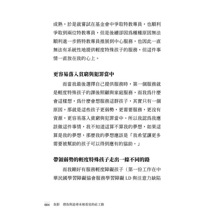 《負影》這本書記錄了文炎這幾年來服務特殊需求孩子的經歷,這些故事並不僅僅是一段段教育紀錄,而是生命中一個個真實而深刻的篇章。無論是在校園中、課後照顧班,還是在家庭與社區中,文炎總是以耐心與方法陪伴這些孩子,走進他們的世界,理解他們的掙扎,並試圖成為他們的支柱。