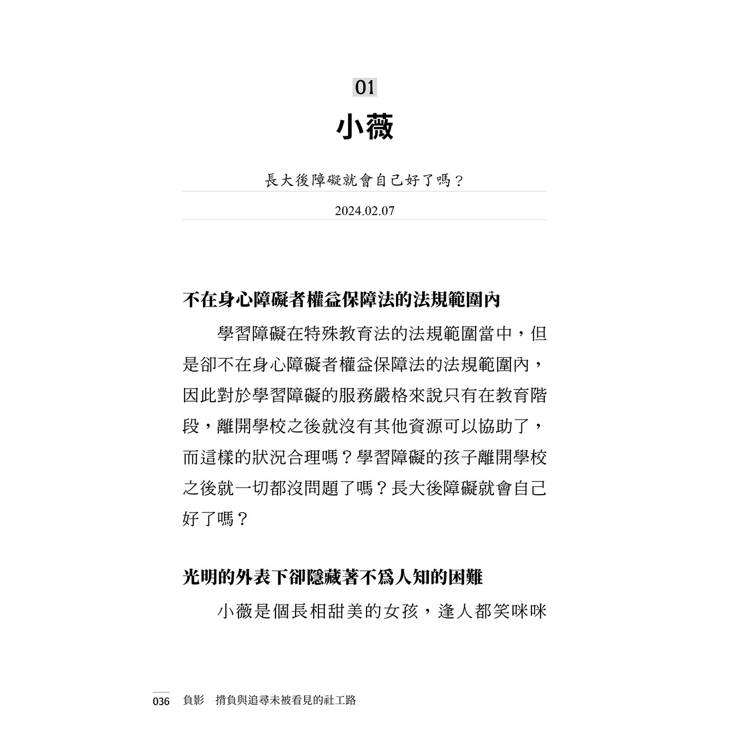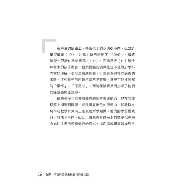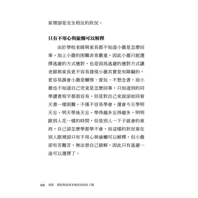 書名《負影》取自孩子們背後那片無聲卻厚重的影子,他們揹負的不只是學業的困難、情緒的衝突,更是社會對「看不見的障礙」所投射的誤解與忽略。作為社會工作者與心理師,我們的責任不僅是「介入服務」,而是成為那束照進陰影裡的光,讓孩子有機會再次相信自己,也相信世界會有理解與接納。