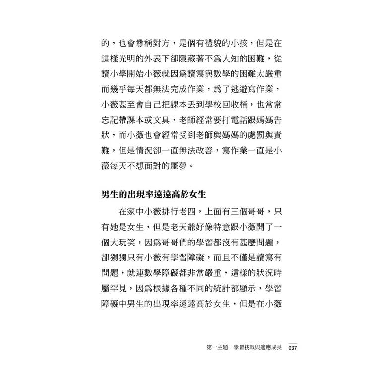 由於學校老師與家長都不知道小薇是怎麼回事,加上小薇的困難非常嚴重,因此小薇只能選擇逃避的方式應對,也是因為逃避的應對方式讓老師與家長更不容易發現小薇其實是有障礙的,更容易誤會小薇是懶惰、愛玩、不想念書,而小薇也不知道自己究竟是怎麼回事,只知道別的同學讀書寫字都很容易,但是對自己來說卻如同看天書一樣困難,不僅不容易學會,還會今天學明天忘,明天學後天忘,學得越多忘得越多,明明跟別人花一樣的時間,但是別人一下子就會的東西,自己卻怎麼學都學不會,而這樣的狀況看在別人眼裡卻只有不用心與偷懶可以解釋,但小薇卻有苦難言,無法替自己辯解,因此只有逃避一途可以選擇了。