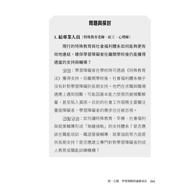 我特別感佩這本書的敘事方式,不是從專業角度居高臨下地診斷問題,而是從現場細膩觀察出發,透過每一位孩子的故事與家庭脈絡,引導我們看見那些常被忽略的需求與可能性。也正因為如此,這本書的每一篇章,都是給不同角色的邀請書:對每一在孩子身邊的人來說,是一次提醒-孩子的學習困難並不是失敗,而是需要方法與時間。對教師與社工來說,是一次反思-我們是否太快將表現不佳歸因為態度,而不是去探究是否有我們沒看見的障礙?對政策制定者與制度推動者來說,是一項挑戰-如何讓現行的支持系統不再碎裂,而是形成一條從早療、學校到就業、生活的無縫支持網。