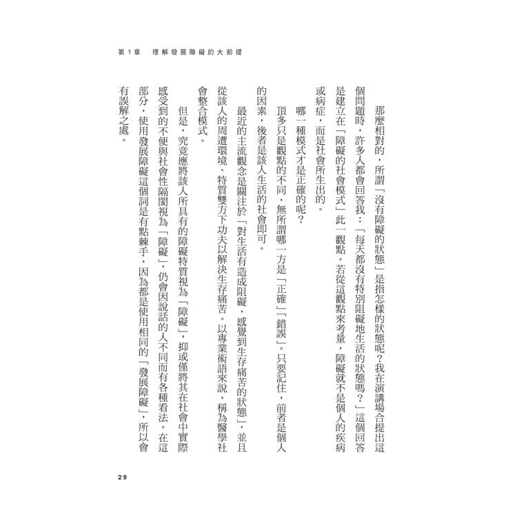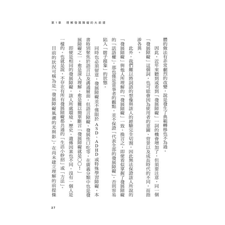 ‧由於發育障礙的特性因人而異,並不存在簡單的解決法,必須耐心地面對每一個人;儘管如此,書中仍指出了應該掌握的關鍵重點,讓我獲益良多。