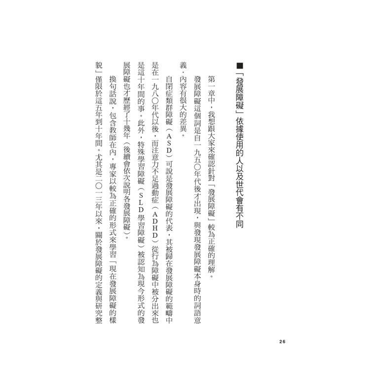 同時也必須留意,發展障礙並不僅限於ASD、ADHD或特殊學習障礙。本書特別聚焦於語言以及溝通層面,但語言障礙、發展性口吃等,在廣義分類中也是發展障礙之一。愈是深入理解,愈是難以簡單斷言「發展障礙就是○○!」