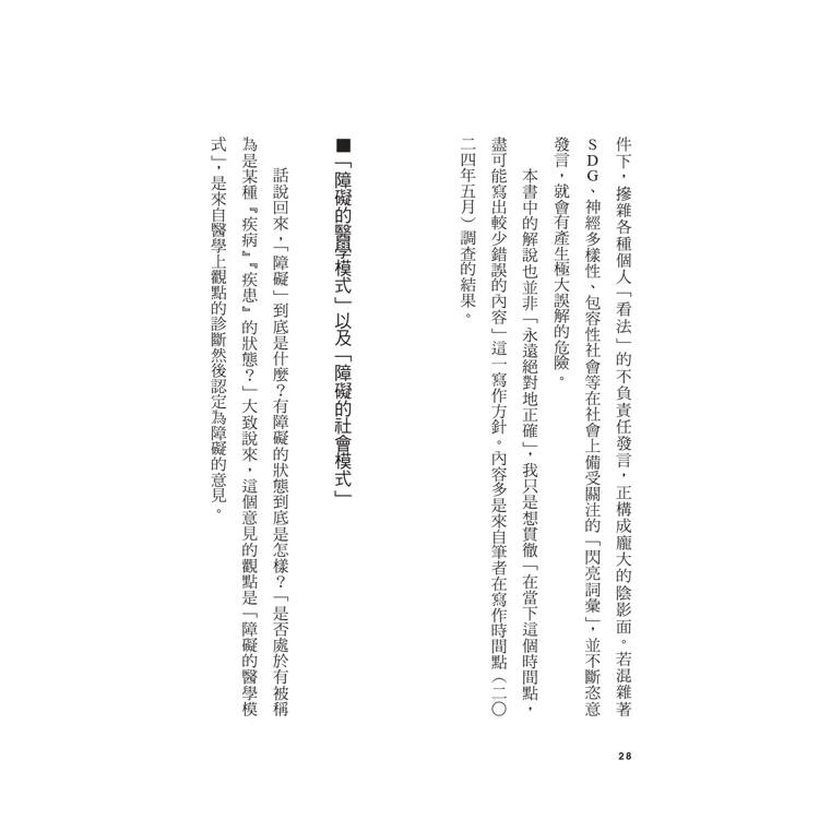 但是,究竟應將該人所具有的障礙特質視為「障礙」,抑或僅將其在社會中實際感受到的不便與社會性隔閡視為「障礙」,仍會因說話的人不同而有各種看法。在這部分,使用發展障礙這個詞是有點棘手,因為都是使用相同的「發展障礙」,所以會有誤解之處。