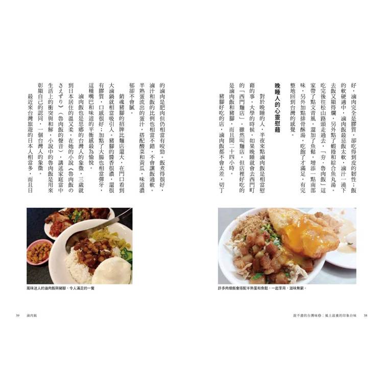 在如此多的台灣飲食文化書寫中,《說不盡的台灣味》的上冊「風土滋養的印象台味」,就是要表達台味說不盡,但還是要說。一開始就從土地說起,從米到白飯的過程,熱騰騰的米飯,每天理所當然,但我們忘記其實得來不易,而且每個台灣人熟悉的滷肉飯,背後竟然有如此多的故事。