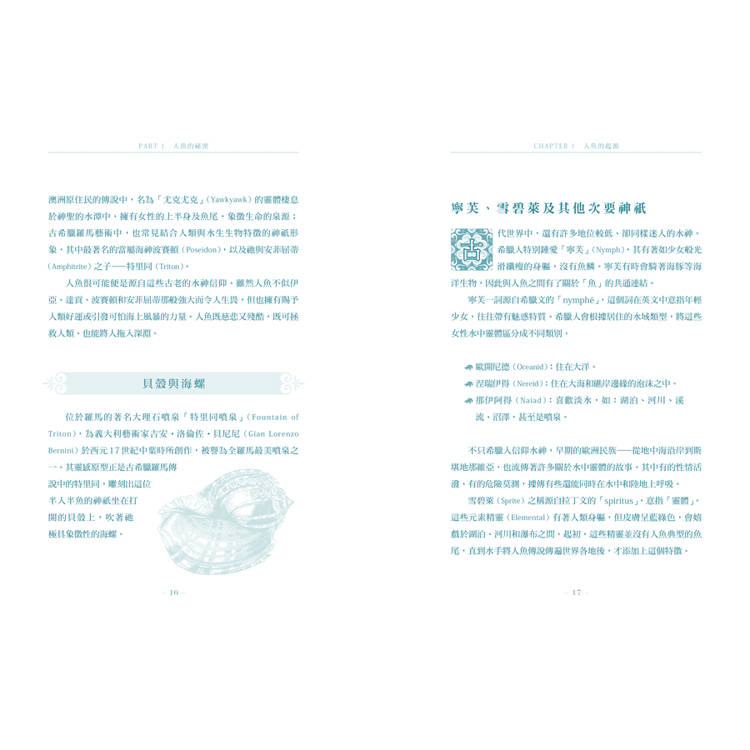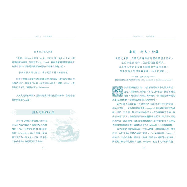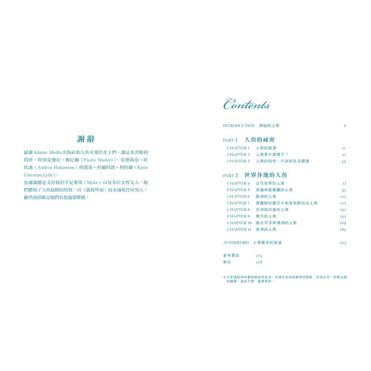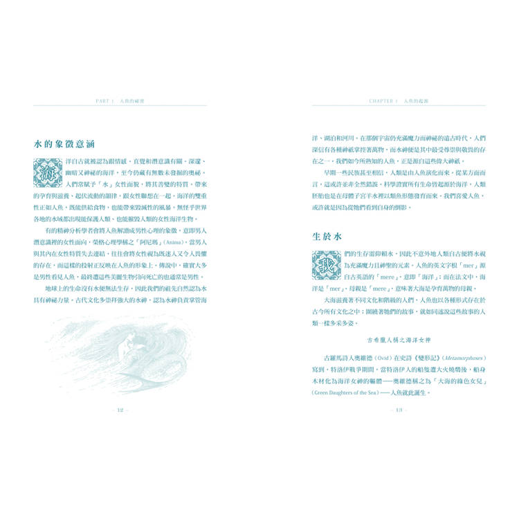 當你在本書的篇章中探索人魚的歷史,閱讀那些繽紛多彩的海洋神話與傳說,甚至因某些奇異的故事莞爾一笑時,你將會發現,自己也逐漸受這些來自深海的迷人生靈所吸引。不過,當你潛入牠們的世界時,請務必謹慎小心──誰知道在那深不可測的海底深淵,還潛伏著什麼未知的祕密呢?