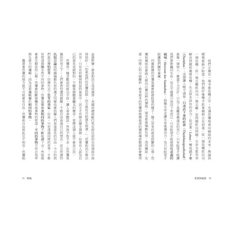 四處散播的恐懼氛圍會扼殺盼望的種子,隨之而來的就是抑鬱的心情。恐懼和懷恨也會將人推向右翼民粹的懷抱。兩者都會煽動仇恨,造成團結、友愛、同理心的分崩離析。愈來愈多的恐懼與愈積愈深的懷恨導致整個社會變得益發野蠻,最後對民主造成傷害。美國前總統歐巴馬在卸任前的告別演說中說得很好:「如果我們向恐懼屈服,民主就有可能發生崩潰。」恐懼和民主無法共容。只有在和解與對話的氣氛中,民主才有辦法健全發展。如果有人認為自己的意見是絕對的,不願意傾聽其他人的聲音,那麼這個人就不會是公民。
