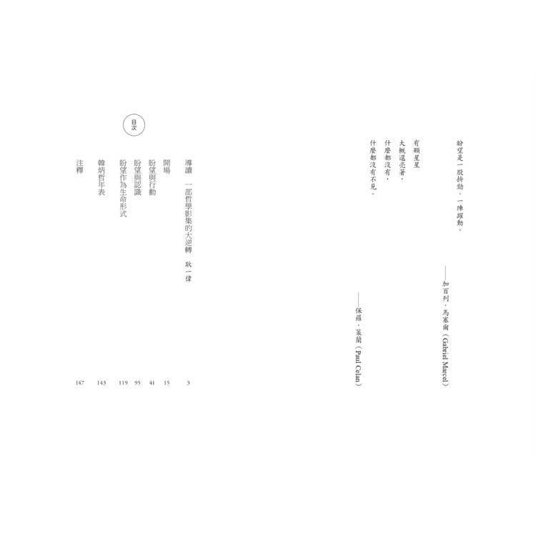 本書是韓炳哲其思想上充滿希望的轉向,在深切剖析時代社會的病徵之後,展開對盼望的反思。書中廣泛論及尼采、卡繆、佛洛姆與漢娜.鄂蘭等思想家對存在的洞見,探究盼望的本質,闡述盼望的精神如何對抗眼下多重危機的恐懼,開闢出嶄新道路,賦予我們生命行動力、洞察力,擁有保持開放且有無限可能的未來。