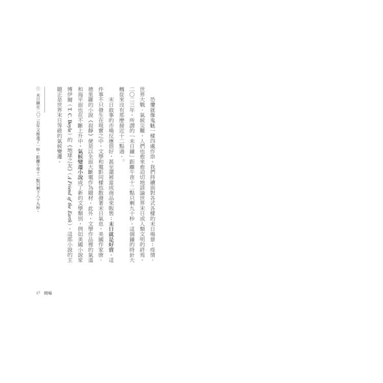 恐懼就像鬼魅一樣四處作祟。我們持續面對各式各樣的末日場景:疫情、世界大戰、氣候災難,人們也愈來愈迫切地談論世界末日或人類文明的終焉。二○二三年,所謂的「末日鐘」距離午夜十二點只剩九十秒。這個鐘的時針大概從來沒有那麼接近十二點過。