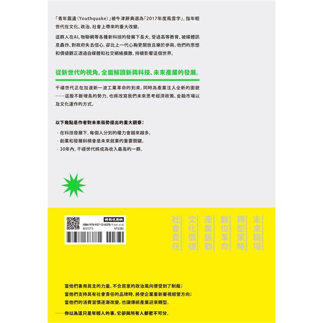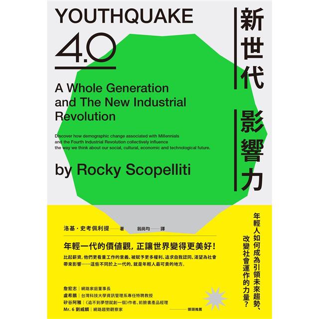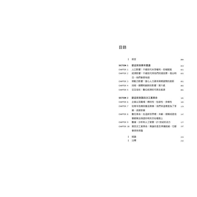本書引用世界一流研究機構的資料以及傑出思想領袖的真知灼見,從千禧世代與第四次工業革命交互作用中,提出職場、科技上的嶄新觀點,重新審視國家、經營者和年輕世代應該扮演的角色。