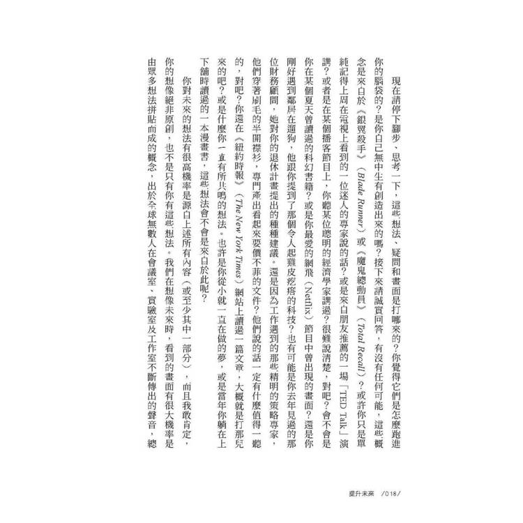 現在請停下腳步、思考一下,這些想法、疑問和畫面是打哪來的?你覺得它們是怎麼跑進你的腦袋的?是你自己無中生有創造出來的嗎?接下來請誠實回答,有沒有任何可能,這些概念是來自於《銀翼殺手》(Blade Runner)或《魔鬼總動員》(Total Recall)?或許你只是單純記得上周在電視上看到的一位迷人的專家說的話?或是來自朋友推薦的一場「TED Talk」演講?或者是在某個播客節目上,你聽某位聰明的經濟學家講過?很難說清楚,對吧?會不會是你在某個夏天曾讀過的科幻書籍?或是你最愛的網飛(Netflix)節目中曾出現的畫面?還是你剛好遇到鄰居在遛狗,他跟你提到了那個令人起雞皮疙瘩的科技?也有可能是你去年見過的那位財務顧問,她對你的退休計畫提出的種種建議。還是因為工作遇到的那些精明的策略專家,他們穿著刷毛的半開襟衫,專門產出看起來要價不菲的文件?他們說的話一定有什麼值得一聽的,對吧?你還在《紐約時報》(The New York Times)網站上讀過一篇文章,大概就是打那兒來的吧?或是什麼你一直有所共鳴的想法。也許是你從小就一直在做的夢,或是當年你躺在上下舖時讀過的一本漫畫書,這些想法會不會是來自於此呢?
