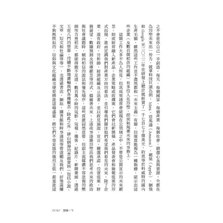 你對未來的想法有很高機率是源自上述所有內容(或至少其中一部分),而且我敢肯定,你的想像絕非原創,也不是只有你有這些想法。我們在想像未來時,看到的畫面有很大機率是由眾多想法拼貼而成的概念,出於全球無數人在會議室、實驗室及工作室不斷傳出的聲音,總之不會是你自己一手創造。每天、每個國家、每個產業、每個社會,窮盡心血與資源,全都在為形塑未來出一份力。就拿科技巨頭為例:Meta、亞馬遜(Amazon)、蘋果(Apple)、網飛和Google光二○二二年在研發上總計就耗資了一千七百七十億美元,約莫等於科威特的國內生產毛額。雖然這些工作並不盡然都和「未來主義」有關,但確實能視為一種指標,顯示出這些企業(及數百間相仿的組織)有多投入在形塑、探索和規畫未來的事務上。