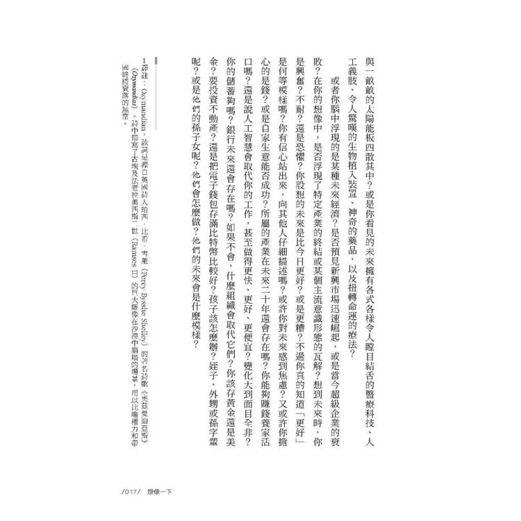 或者你腦中浮現的是某種未來經濟?是否預見新興市場迅速崛起,或是當今超級企業的衰敗?在你的想像中,是否浮現了特定產業的終結或某個主流意識形態的瓦解?想到未來時,你是興奮?不耐?還是恐懼?你設想的未來是比今日更好?或是更糟?不過你真的知道「更好」是何等模樣嗎?你有信心站出來,向其他人仔細描述嗎?或許你對未來感到焦慮?又或許你擔心的是錢?或是自家生意能否成功?所屬的產業在未來二十年還會存在嗎?你能夠賺錢養家活口嗎?還是說人工智慧會取代你的工作,甚至做得更快、更好、更便宜?變化大到面目全非?你的儲蓄夠嗎?銀行未來還會存在嗎?如果不會,什麼組織會取代它們?你該存黃金還是美金?要投資不動產?還是把電子錢包存滿比特幣比較好?孩子該怎麼辦?姪子、外甥或孫字輩呢?或是他們的孫子女呢?他們會怎麼做?他們的未來會是什麼模樣?