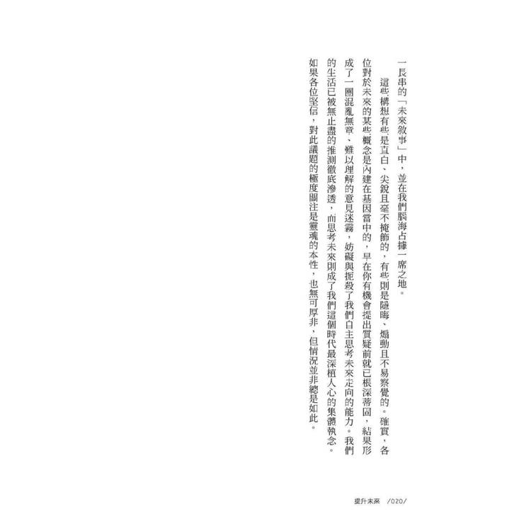 這些構想有些是直白、尖銳且毫不掩飾的,有些則是隱晦、煽動且不易察覺的。確實,各位對於未來的某些概念是內建在基因當中的,早在你有機會提出質疑前就已根深蒂固,結果形成了一團混亂無章、難以理解的意見迷霧,妨礙與扼殺了我們自主思考未來走向的能力。我們的生活已被無止盡的推測徹底滲透,而思考未來則成了我們這個時代最深植人心的集體執念。如果各位堅信,對此議題的極度關注是靈魂的本性,也無可厚非,但情況並非總是如此。