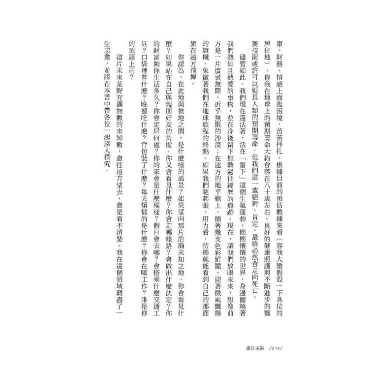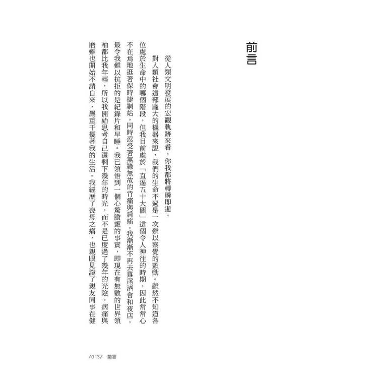 對人類社會這部龐大的機器來說,我們的生命不過是一次難以察覺的顫動。雖然不知道各位處於生命中的哪個階段,但我目前處於「直逼五十大關」這個令人神往的時期,因此常常心不在焉地逛著保時捷網站,同時忍受著無緣無故的背痛與肩痛。我漸漸不再去雞尾酒會和夜店,最令我難以抗拒的是紀錄片和早睡。我已領悟到一個心驚膽顫的事實,即現在有無數的世界領袖都比我年輕,所以我開始思考自己還剩下幾年的時光,而不是已度過了幾年的光陰。病痛與磨難也開始不請自來,嚴重干擾著我的生活。我經歷了喪母之痛,也親眼見證了親友同事在健康、財務、情感上面臨困境,苦苦掙扎。根據目前的預估數據來看(容我大膽假設一下各位的居住地),你我在地球上的預期壽命大約會落在八十歲左右。良好的健康照護與不斷進步的醫藥技術或許可以延長人類的預期壽命,但我們這一輩絕對、肯定、最終必然會走向死亡。
