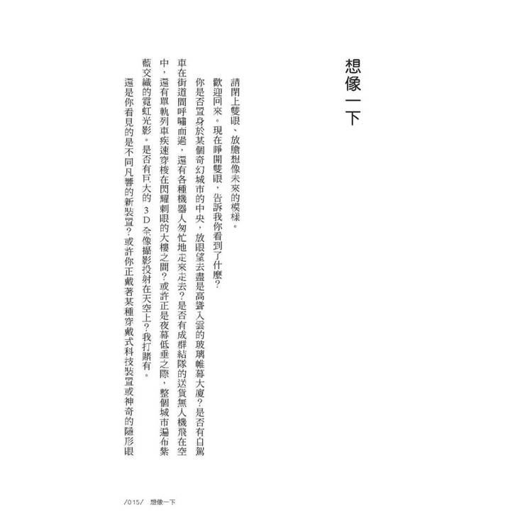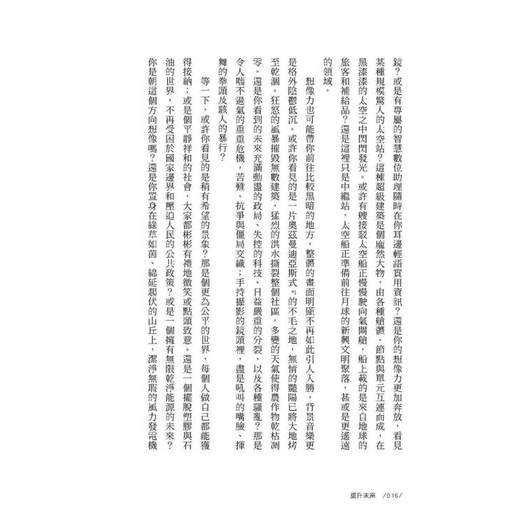 等一下,或許你看見的是稍有希望的景象?那是個更為公平的世界,每個人做自己都能獲得接納;或是個平靜祥和的社會,大家都彬彬有禮地微笑或點頭致意。還是一個擺脫塑膠與石油的世界,不再受困於國家邊界和壓迫人民的公共政策?或是一個擁有無限乾淨能源的未來?你是朝這個方向想像嗎?還是你置身在綠草如茵、綿延起伏的山丘上,潔淨無瑕的風力發電機與一畝畝的太陽能板四散其中?或是你看見的未來擁有各式各樣令人瞠目結舌的醫療科技、人工義肢、令人驚嘆的生物植入裝置、神奇的藥品,以及扭轉命運的療法?