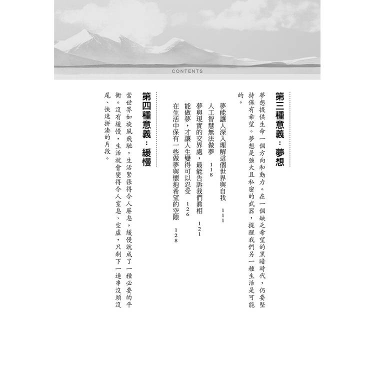 我說過,我們必須訓練自己思考長遠的未來和反思過往。緩慢就像肌肉,不常使用就會萎縮。意義不是零和遊戲。生命的豐富與厚度取決於你能建立起的連結數量與品質,視野提升得更高也不代表會失去眼前的親密和細膩。不過,這一切都得慢慢來。