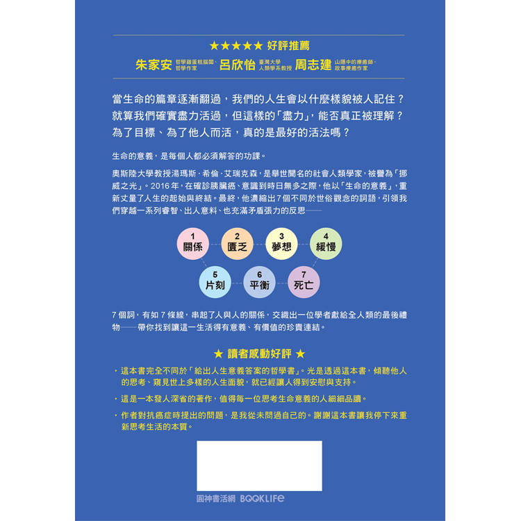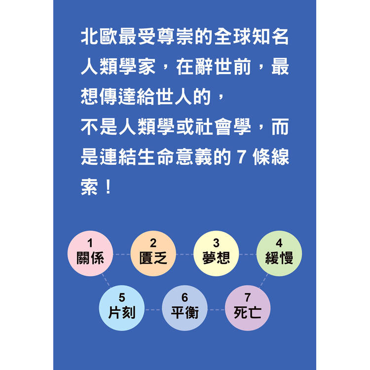 7個詞,有如7條線,串起了人與人的關係,交織出一位學者獻給全人類的最後禮物──帶你找到讓這一生活得有意義、有價值的珍貴連結。