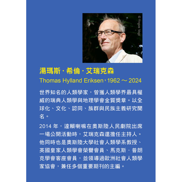 湯瑪斯.希倫.艾瑞克森是本世紀最具國際影響力的挪威人類學者。他著作等身,擅長以貼近大眾的書寫方式,將人類學觀點帶入公共領域。本書記錄了他在病中對生命意義的沉思,展現人類學視野在個人面臨至大危機時,所能提供的指引與慰藉,例如:他從經典的禮物研究中衍生出的體悟,告訴我們「與他人的關係」乃是生命存在的核心。而在令人動容的最終章,他借用跨文化的生命哲學提醒我們,死亡並非終點,而是每個個體所屬的更大生命循環的一部分。