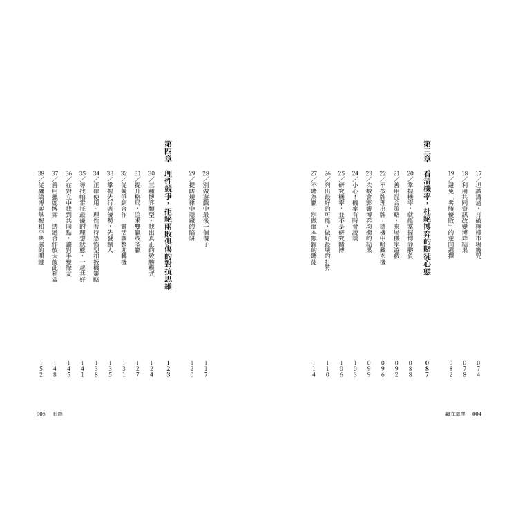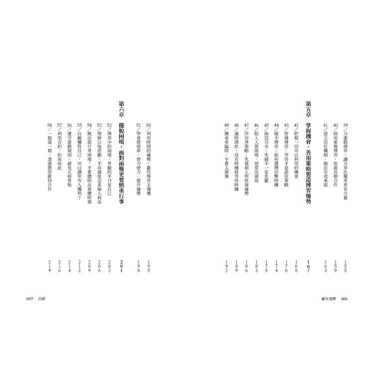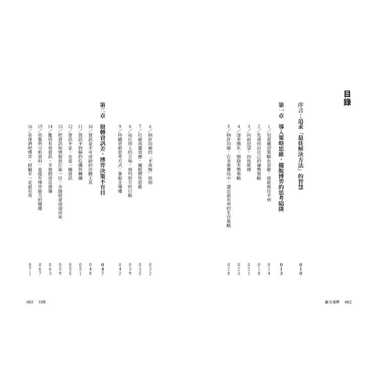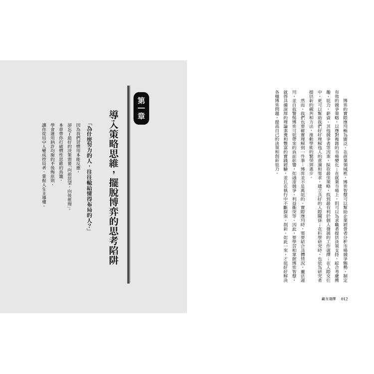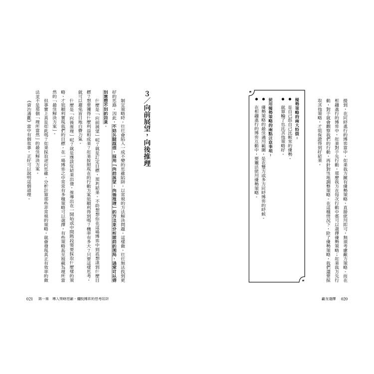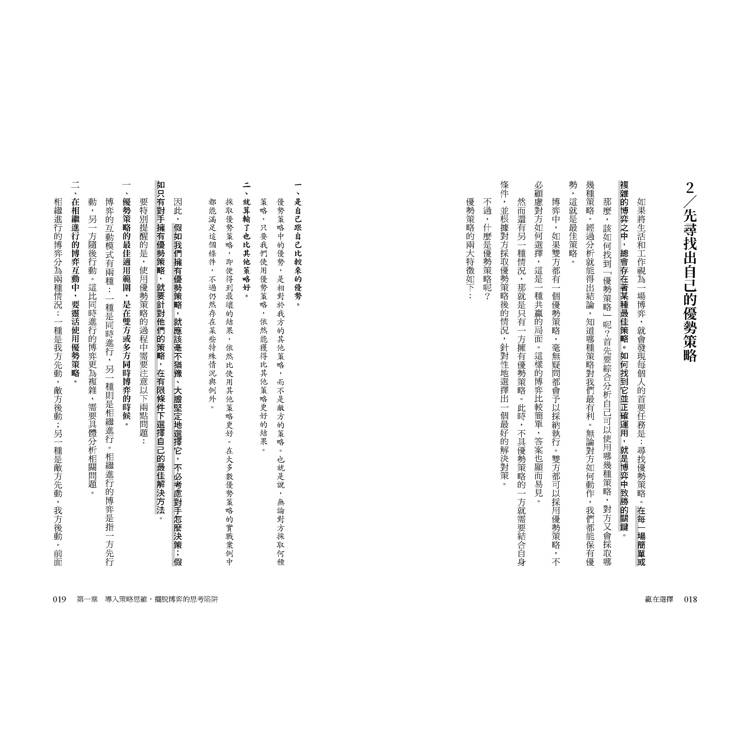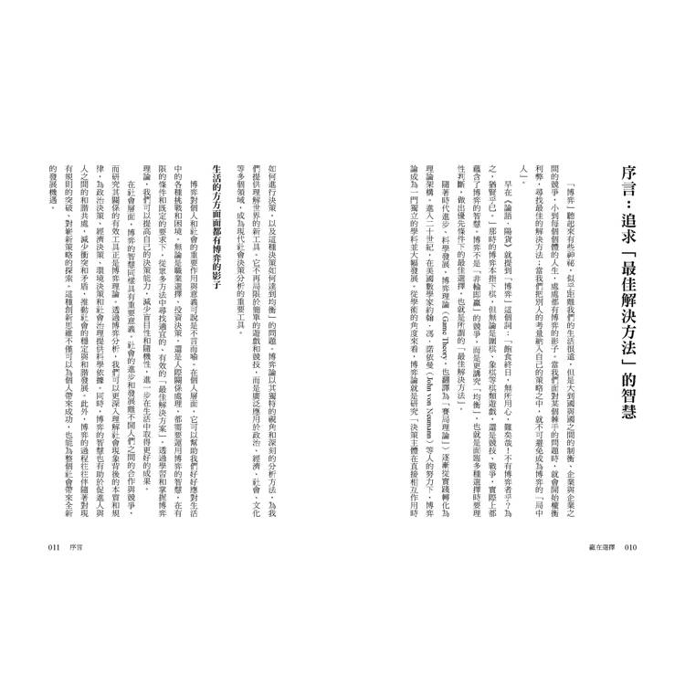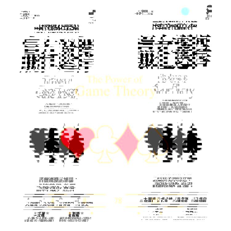序言:追求「最佳解決方法」的智慧「博弈」聽起來有些神祕,似乎距離我們的生活很遠,但是大到國與國之間的制衡、企業與企業之間的競爭,小到每個個體的人生,處處都有博弈的影子。當我們面對某個棘手的問題時,就會開始權衡利弊,尋找最佳的解決方法;當我們把別人的考量納入自己的策略之中,就不可避免成為博弈的「局中人」。 早在《論語.陽貨》就提到「博弈」這個詞:「飽食終日,無所用心,難矣哉!不有博弈者乎?為之,猶賢乎已。」那時的博弈本指下棋,但無論是圍棋、象棋等棋類遊戲,還是競技、戰爭,實際上都蘊含了博弈的智慧。博弈不是「非輸即贏」的競爭,而是更講究「均衡」,也就是面臨多種選擇時要理性判斷,做出優先條件下的最佳選擇,也就是所謂的「最佳解決方法」。 隨著時代進步、科學發展,博弈理論(Game Theory,也翻譯為「賽局理論」)逐漸從實踐轉化為理論架構。進入二十世紀,在美國數學家約翰.馮.諾依曼(John von Neumann)等人的努力下,博弈論成為一門獨立的學科並大幅發展。從學術的角度來看,博弈論就是研究「決策主體在直接相互作用時如何進行決策,以及這種決策如何達到均衡」的問題。博弈論以其獨特的視角和深刻的分析方法,為我們提供理解世界的新工具。它不再局限於簡單的遊戲和競技,而是廣泛應用於政治、經濟、社會、文化等多個領域,成為現代社會決策分析的重要工具。 生活的方方面面都有博弈的影子博弈對個人和社會的重要作用與意義可說是不言而喻。在個人層面,它可以幫助我們好好應對生活中的各種挑戰和困境。無論是職業選擇、投資決策,還是人際關係處理,都需要運用博弈的智慧,在有限的條件和既定的要求下,從眾多方法中尋找適宜的、有效的「最佳解決方案」。透過學習和掌握博弈理論,我們可以提高自己的決策能力,減少盲目性和隨機性,進一步在生活中取得更好的成果。 在社會層面,博弈的智慧同樣具有重要意義。社會的進步和發展離不開人們之間的合作與競爭,而研究其關係的有效工具正是博弈理論。透過博弈分析,我們可以更深入理解社會現象背後的本質和規律,為政治決策、經濟決策、環境決策和社會治理提供科學依據。同時,博弈的智慧也有助於促進人與人之間的和諧共處,減少衝突和矛盾,推動社會的穩定與和諧發展。此外,博弈的過程往往伴隨著對現有規則的突破、對嶄新策略的探索。這種創新思維不僅可以為個人帶來成功,也能為整個社會帶來全新的發展機遇。 博弈的實際應用極為廣泛。在商業領域裡,博弈智慧可以幫助企業經營者分析市場競爭態勢,制定有效的競爭策略,以應對複雜的市場變化;在就業市場上,則可以為求職者提供決策支持,綜合考慮興趣、能力、薪資、其他競爭者等因素,採取最佳策略,找到最有利於個人發展的工作選擇;在人際交往中,更可以幫助我們好好理解他人的意圖和需求,建立良好的人際關係;在科學研究時,也能為研究者提供新的視角和方法,推動學術的繁榮與進步。 然而,我們也要確實理解到一件事:博弈並不是萬能的。實際應用時,需要結合具體情況,靈活運用,並自我警惕博弈可能帶來的負面影響,如過度競爭、利益衝突等。因此,要學習和掌握博弈智慧,就得具備深厚的理論素養和豐富的實踐經驗,並且在執行中不斷探索、創新。如此一來,才能好好解決各種博弈問題,提高自己的決策和創新能力。