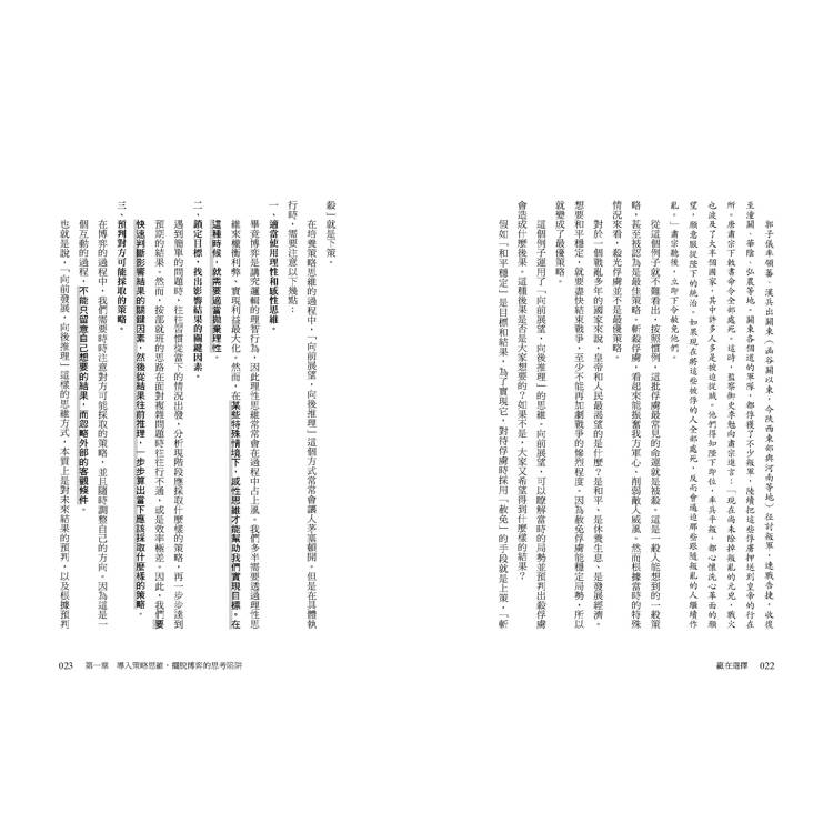 制定策略時,往往會陷入一成不變的思維陷阱,以常規的方法解決問題。這樣做,往往無法找到更好的思路。因此,不妨另闢蹊徑,採用「向前展望,向後推理」的方法來分析眼前的困局,通常可以得到意想不到的效果。  什麼是「向前展望」呢?就是訂定目標,預判結果。不妨想想你在這場博弈中到底想達到什麼目標?想要獲得什麼利益和成果?如果按照現在的行動方案能順利得到嗎?機率有多大?只要這樣思考,就可以避免盲目地白費力氣。  什麼是「向後推理」呢?就是應該從結果出發,推導出在一開始或中間階段需要採取什麼樣的策略,才能順利實現我們的目標。在一場博弈之中常常有多種策略可以選擇,有些策略甚至被視為理所當然的「最佳解決方案」。  但事實上真是如此嗎?如果採取逆向思維,分析計算那些非常規的策略,就會發現真正有效率的做法並不是那個「理所當然」的最佳解決方案。  《資治通鑑》當中有個故事,正好可以說明這個道理。  郭子儀率領蕃、漢兵出關東(函谷關以東,今陝西東部與河南等地)征討叛軍,連戰告捷,收復至潼關、華陰、弘農等地。關東各個道的軍隊,都俘獲了不少叛軍,陸續把這些俘虜押送到皇帝的行在所。唐肅宗下敕書命令全部處死。這時,監察御史李勉向肅宗進言:「現在尚未除掉叛亂的元兇,戰火也波及了大半個國家,其中許多人多是被迫從賊。他們得知陛下即位,率兵平叛,都心懷洗心革面的願望,願意服從陛下的統治。如果現在將這些被俘的人全部處死,反而會逼迫那些跟隨叛亂的人繼續作亂。」肅宗聽後,立即下令赦免他們。  從這個例子就不難看出,按照慣例,這批俘虜最常見的命運就是被殺。這是一般人能想到的一般策略,甚至被認為是最佳策略。斬殺俘虜,看起來能振奮我方軍心、削弱敵人威風。然而根據當時的特殊情況來看,殺光俘虜並不是最優策略。 對於一個戰亂多年的國家來說,皇帝和人民最渴望的是什麼?是和平、是休養生息、是發展經濟。想要和平穩定,就要盡快結束戰爭,至少不能再加劇戰爭的慘烈程度。因為赦免俘虜能穩定局勢,所以就變成了最優策略。  這個例子運用了「向前展望,向後推理」的思維。向前展望,可以瞭解當時的局勢並預判出殺俘虜會造成什麼後果。這種後果是否是大家想要的?如果不是,大家又希望得到什麼樣的結果?  假如「和平穩定」是目標和結果,為了實現它,對待俘虜時採用「赦免」的手段就是上策,「斬殺」就是下策。  在培養策略思維的過程中,「向前展望,向後推理」這個方式常常會讓人茅塞頓開。但是在具體執行時,需要注意以下幾點:  一、適當使用理性和感性思維。 畢竟博弈是講究邏輯的理智行為,因此理性思維常常會在過程中占上風。我們多半需要透過理性思維來權衡利弊、實現利益最大化。然而,在某些特殊情境下,感性思維才能幫助我們實現目標。在這種時候,就需要適當拋棄理性。  二、鎖定目標,找出影響結果的關鍵因素。遇到簡單的問題時,往往習慣從當下的情況出發,分析現階段應採取什麼樣的策略,再一步步達到預期的結果。然而,按部就班的思路在面對複雜問題時往往行不通,或是效率極差。因此,我們要快速判斷影響結果的關鍵因素,然後從結果往前推理,一步步算出當下應該採取什麼樣的策略。  三、預判對方可能採取的策略。在博弈的過程中,我們需要時時注意對方可能採取的策略,並且隨時調整自己的方向。因為這是一個互動的過程,不能只留意自己想要的結果,而忽略外部的客觀條件。  也就是說,「向前發展,向後推理」這樣的思維方式,本質上是對未來結果的預判,以及根據預判而制定的策略方案,並非是真正得到了結果。如果在博弈過程中,雙方的客觀條件改變,或是出現了變數,都會大大影響整個結局