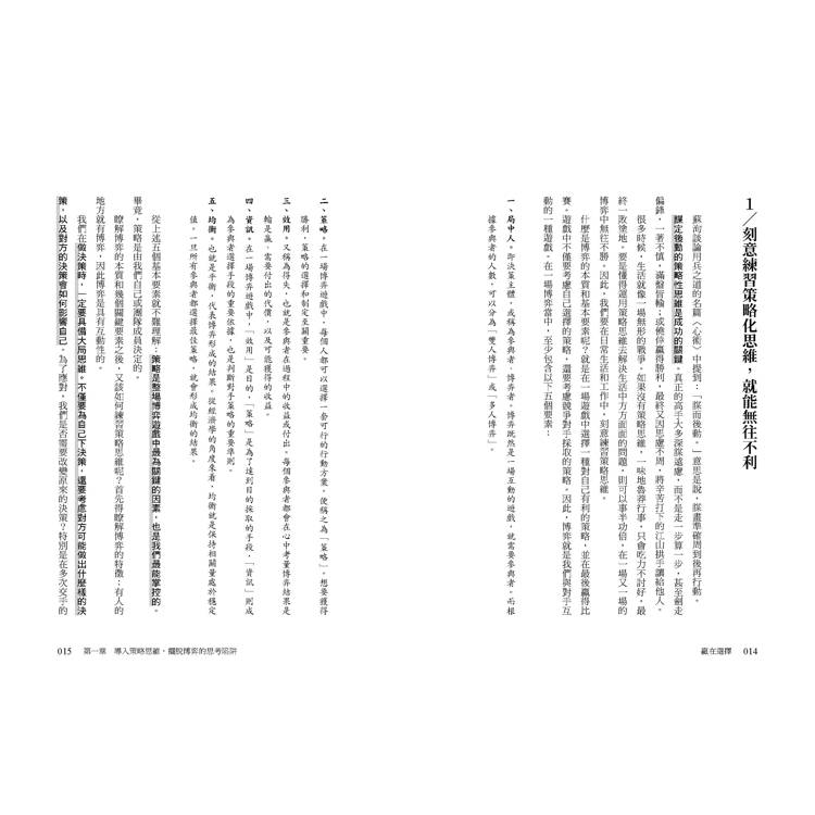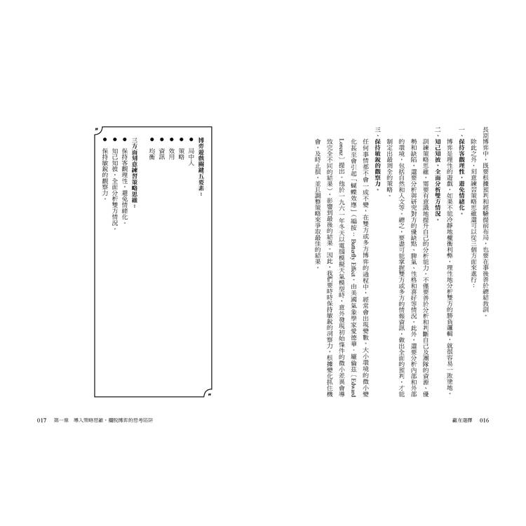 第一章 導入策略思維,擺脫博弈的思考陷阱 1/刻意練習策略化思維,就能無往不利 蘇洵談論用兵之道的名篇〈心術〉中提到:「謀而後動。」意思是說,謀畫準確周到後再行動。  謀定後動的策略性思維是成功的關鍵。真正的高手大多深謀遠慮,而不是走一步算一步,甚至劍走偏鋒,一著不慎,滿盤皆輸;或僥倖贏得勝利,最終又因思慮不周,將辛苦打下的江山拱手讓給他人。  很多時候,生活就像一場無形的戰爭。如果沒有策略思維,一味地魯莽行事,只會吃力不討好,最終一敗塗地。要是懂得運用策略思維去解決生活中方方面面的問題,則可以事半功倍,在一場又一場的博弈中無往不勝。因此,我們要在日常生活和工作中,刻意練習策略思維。  什麼是博弈的本質和基本要素呢?就是在一場遊戲中選擇一種對自己有利的策略,並在最後贏得比賽。遊戲中不僅要考慮自己選擇的策略,還要考慮競爭對手採取的策略。因此,博弈就是我們與對手互動的一種遊戲。在一場博弈當中,至少包含以下五個要素: