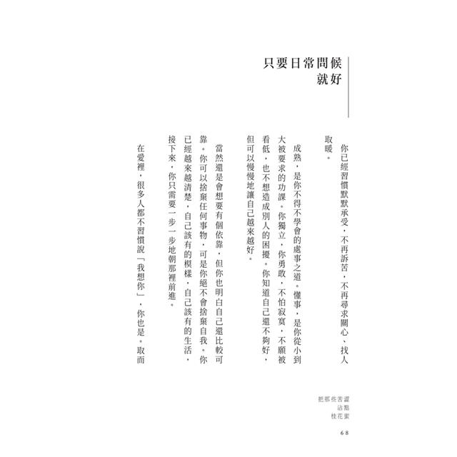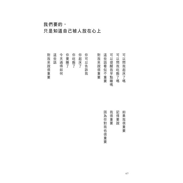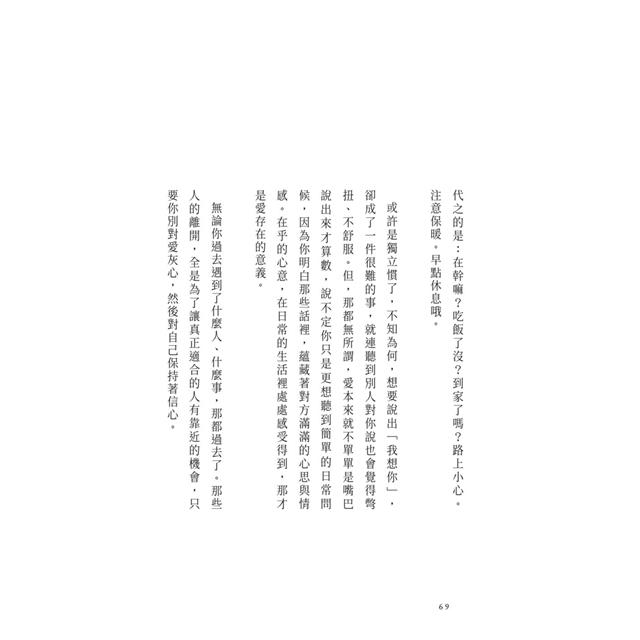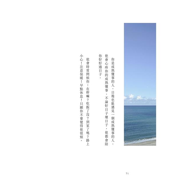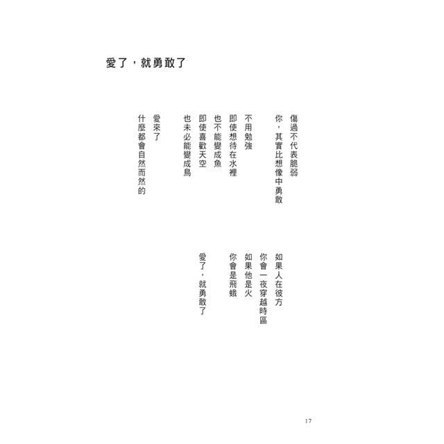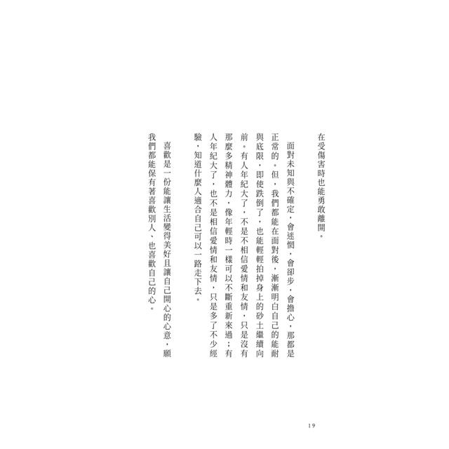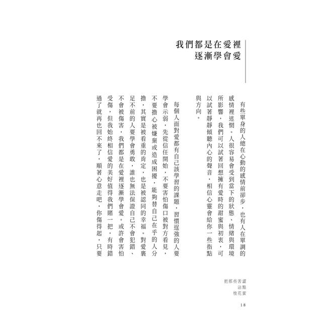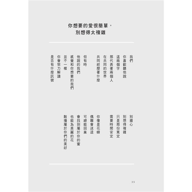 在這本書中,我想與你分享「愛情裡的不同模樣」,一起去看看自己的破碎與需要被理解的地方。從另一個面向來看,那也是我們在愛情裡曾有的經歷,相識與相戀,從失去到接受,然後走出傷心,開始相信自己有美好的未來。