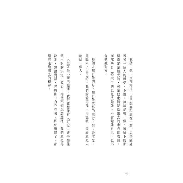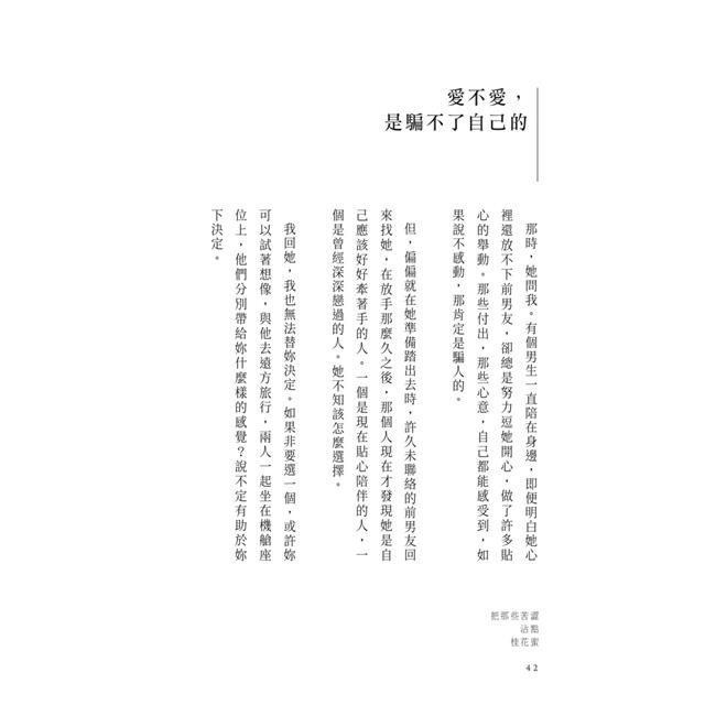 「離開一個人難免傷心,不過把他留下來,只會讓自己更傷心,不如讓彼此去探尋更適合的方向,去形塑出符合自己理想中愛情的模樣。」