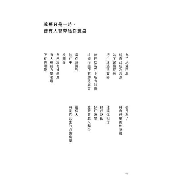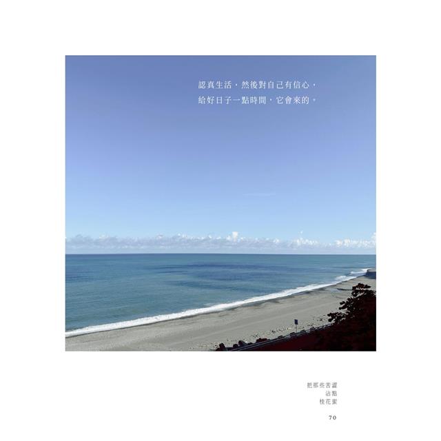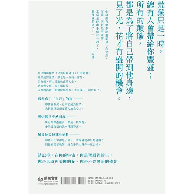 期盼這本小小的作品,能在你走出生命低谷的路上點燃小小的火光,要相信自己一定能走出來,所有的顛沛都是變得更好的過程。就像我常寫的:「沒事了,一切都會越來越好。」